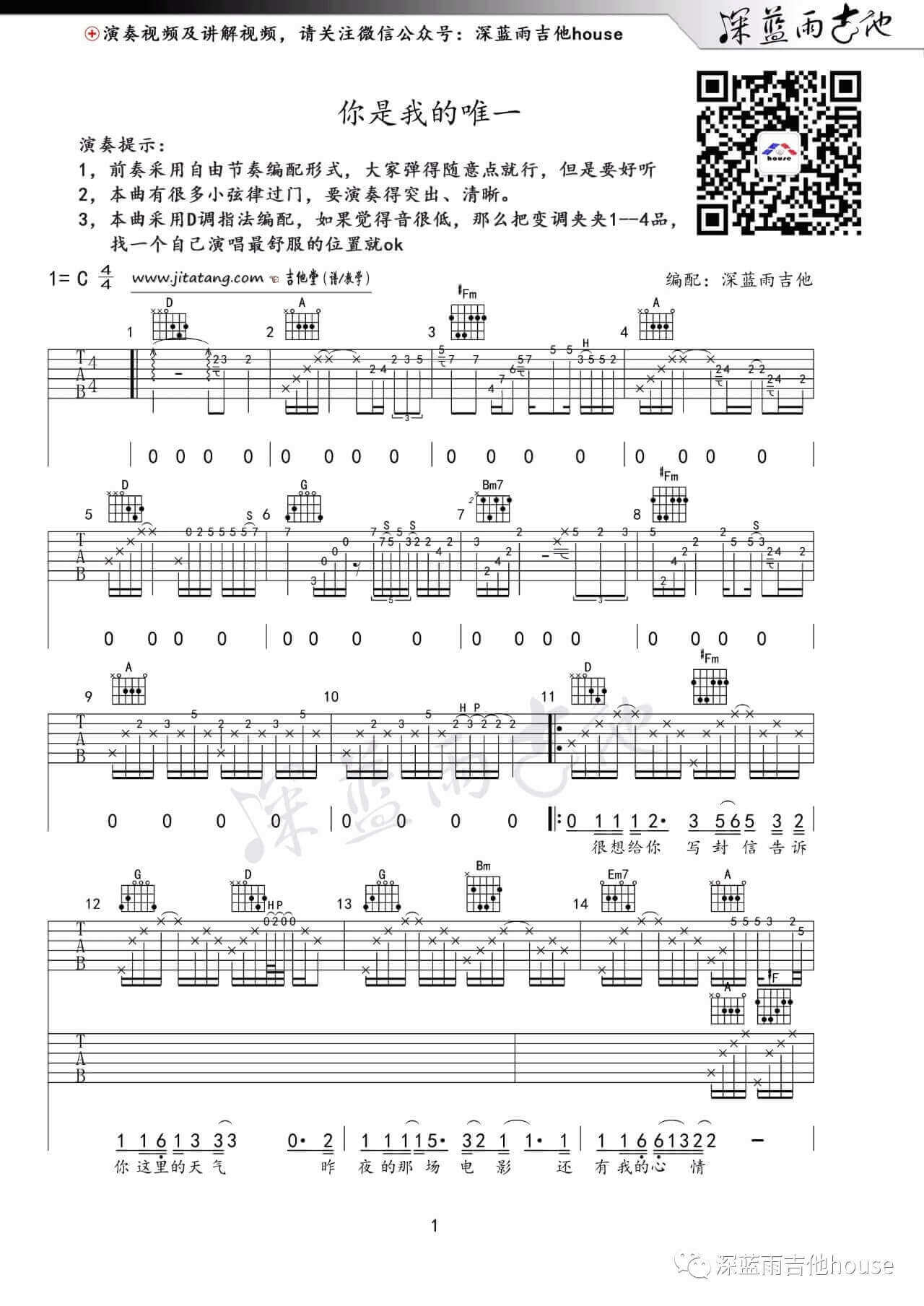 曲谱介绍: 你是我的唯一吉他谱采用了C调指法,由深蓝雨吉他编配完成。听兄弟说,凉城吉他谱听了耳朵会怀孕,快快学起来,学完去撩妹! <iframe src="https://player.youku.com/embed/XMjUyMTI1NjE1Mg==?client_id=b554c99700ae9bf8" width="880"</iframe> 吉他弹唱演示及视频教学 <iframe src="https://player.youku.com/embed/XMjUyMTI1NjE1Mg==?client_id=b554c99700ae9bf8" width="880"</iframe> 吉他弹唱演示及视频教学