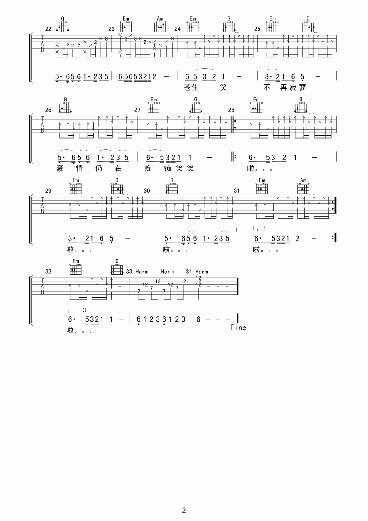 曲谱介绍: 《沧海一声笑》吉他弹唱谱,采用C调指法编配,共有3张高清图谱。