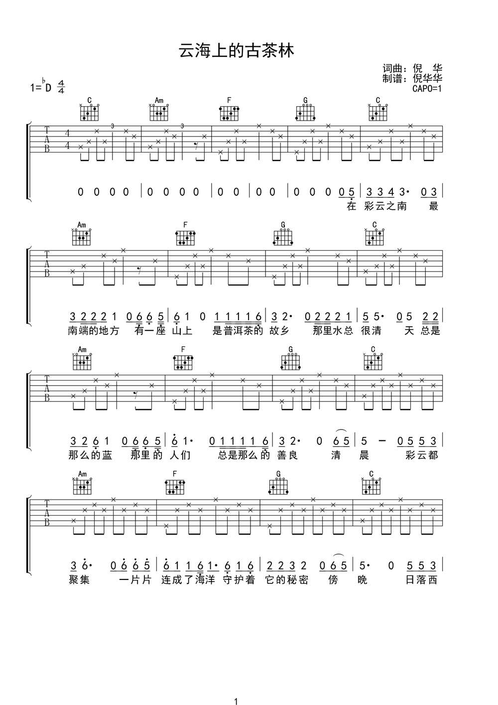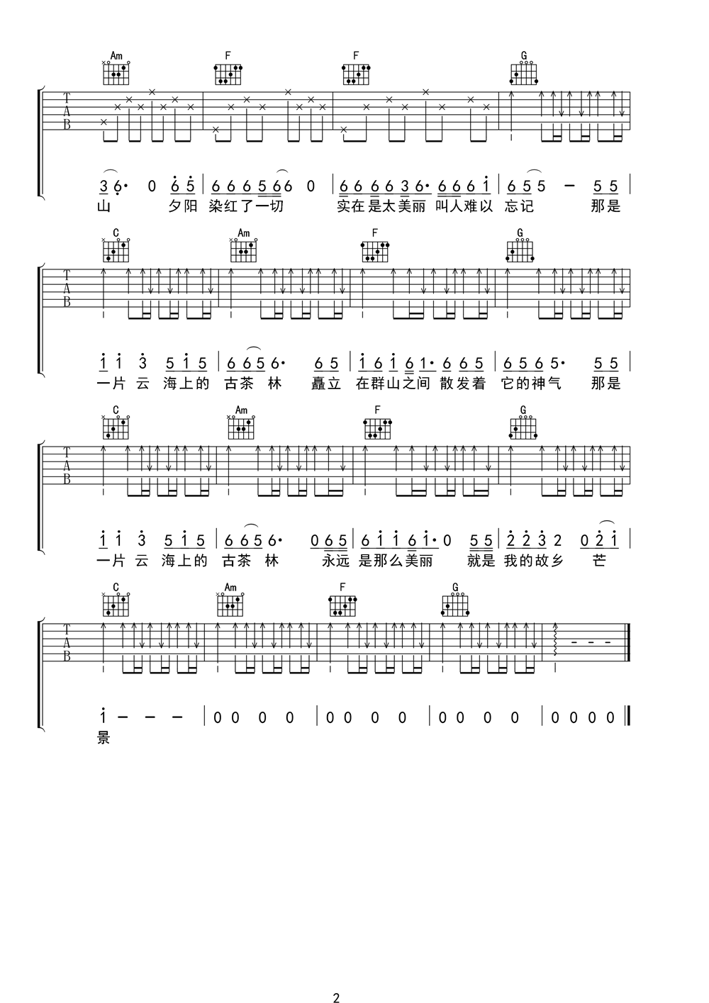 曲谱介绍: 云海上的古茶林《云海上的古茶林_》吉他弹唱谱,共有2张高清图谱,免翻页排版设计。