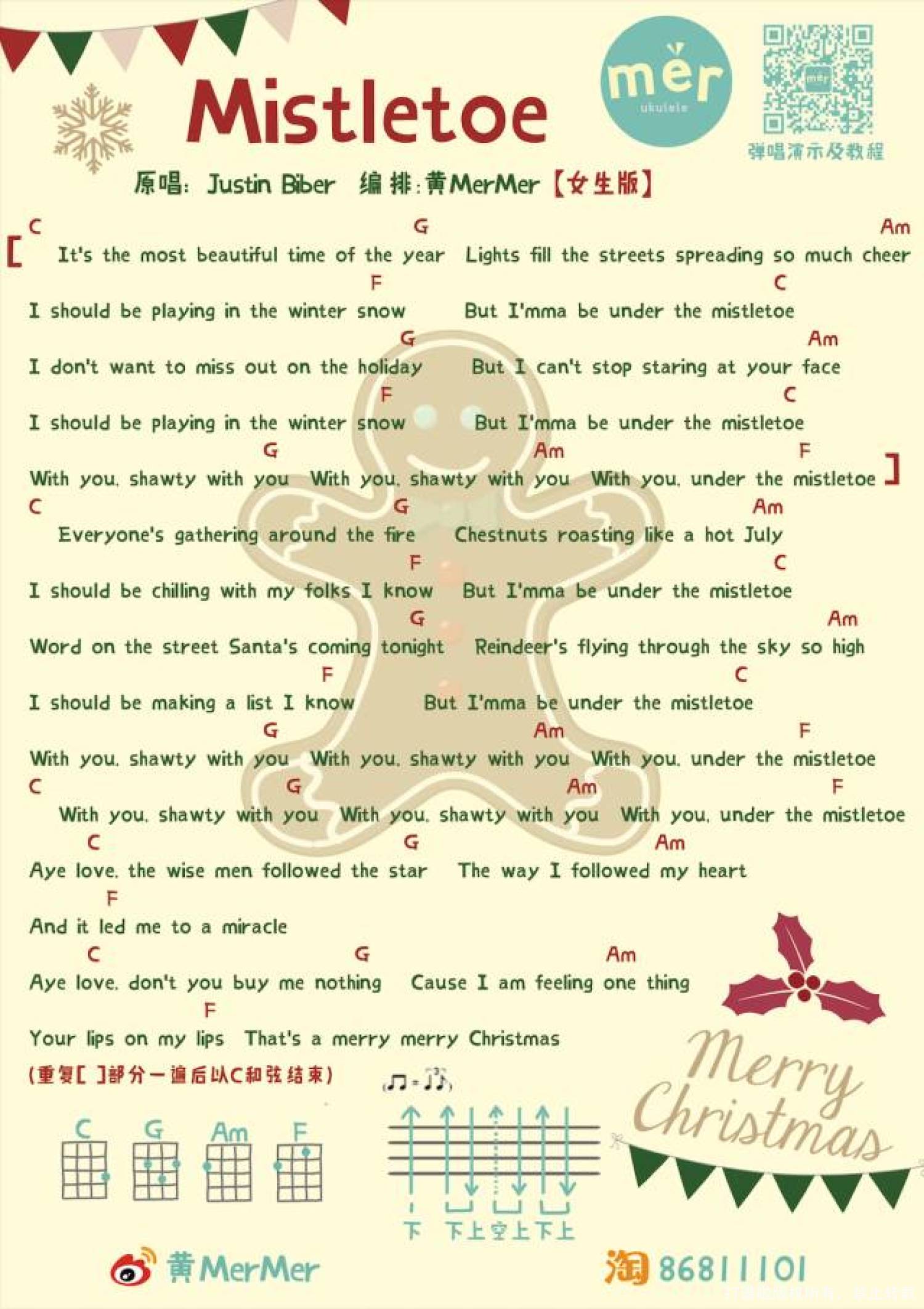 曲谱介绍: MerMer说: 虽然不是比伯的脑残粉,但每年的圣诞歌单里面,一定有这首<Mistletoe>哒~甜甜地~忍不住疯狂抖腿! 尤克里里Cover   Mistletoe 尤克里里谱