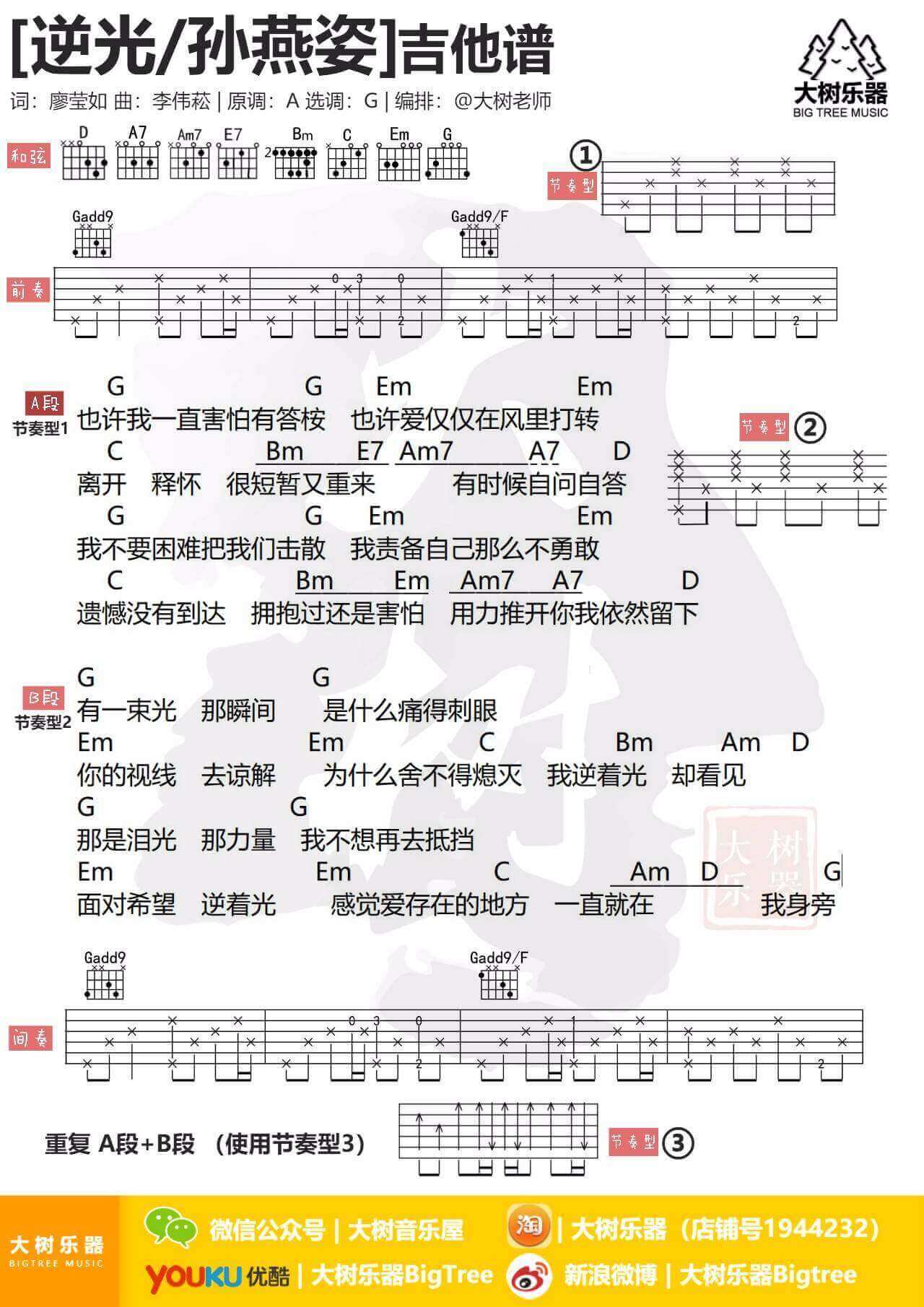 曲谱介绍: 逆光吉他谱采用了G调指法,由大树音乐屋编配完成。《逆光》是孙燕姿演唱的,孙燕姿的声音温柔清亮,每次唱歌她的情绪都十分饱满,不需要过多的演唱技巧,一开口就深深抓住了听众的耳朵,在这首歌曲的演绎之中,她的声音干脆利落,旋律流畅舒适,抑制不住的歌曲所表达的忧伤。面对希望,逆着光,感受爱存在的地方。我们都应该勇敢地向前走,不论有多困难,努力做照亮自己的那一道光。另外,这首满满的都是爱吉他谱也超级好听,小伙伴们有福啦,还不去练起来?