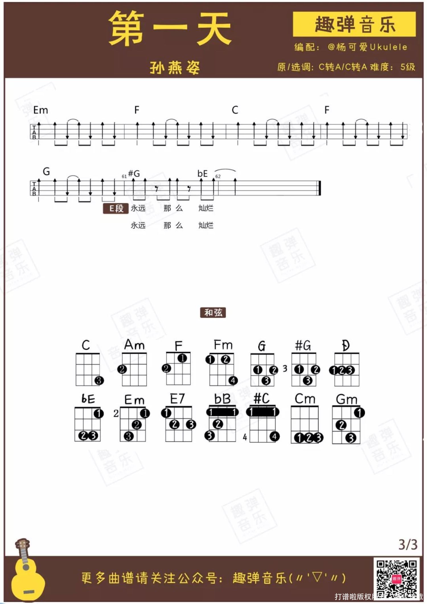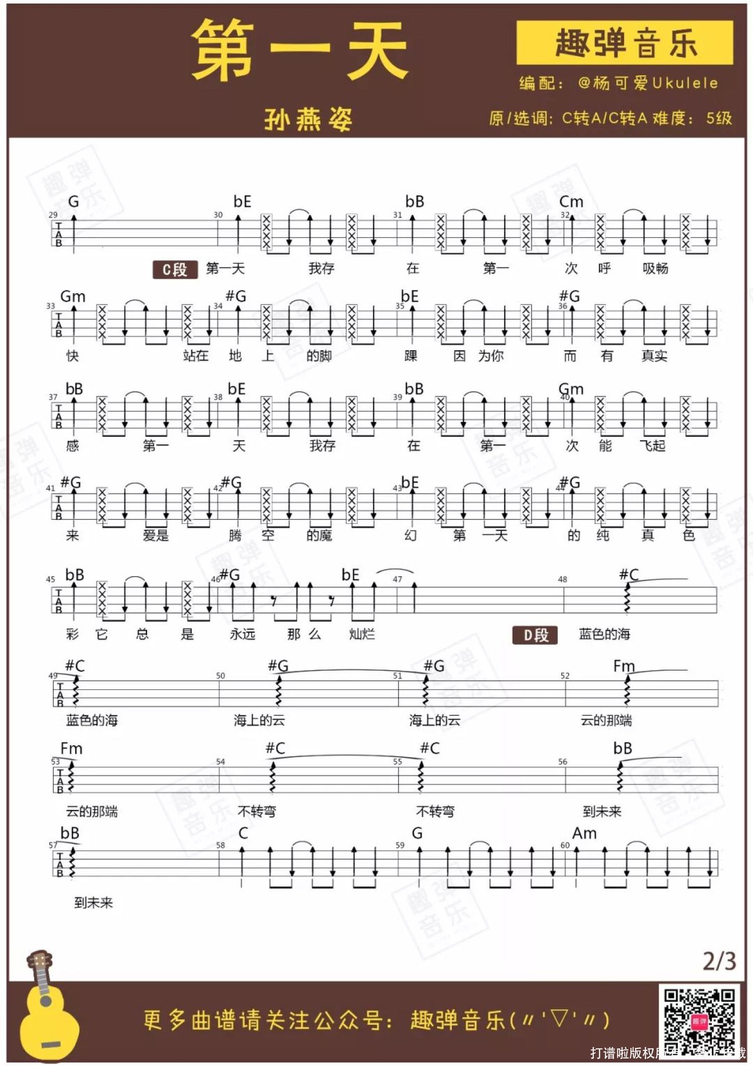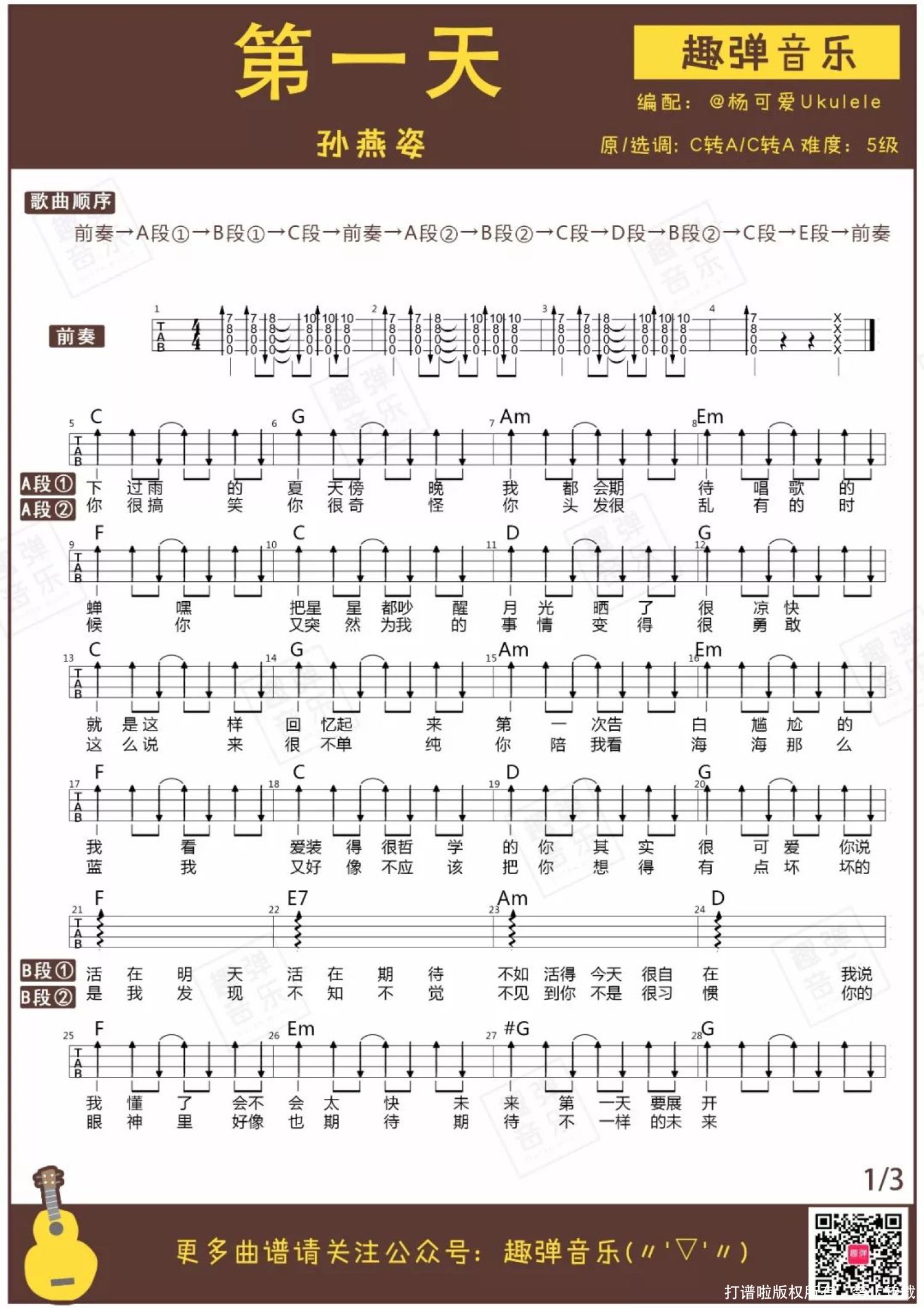 曲谱介绍: 《第一天》尤克里里谱 开启一天的早餐要吃好,作为一整年的开始,2018年的第一首歌当然也要活力满满,不来一点轻松跳跃的节奏怎么行? 点下《第一天》的播放键,源源不断的能量就会从耳朵涌向身体,似乎找到了坚强的插座,浑身都是干劲!