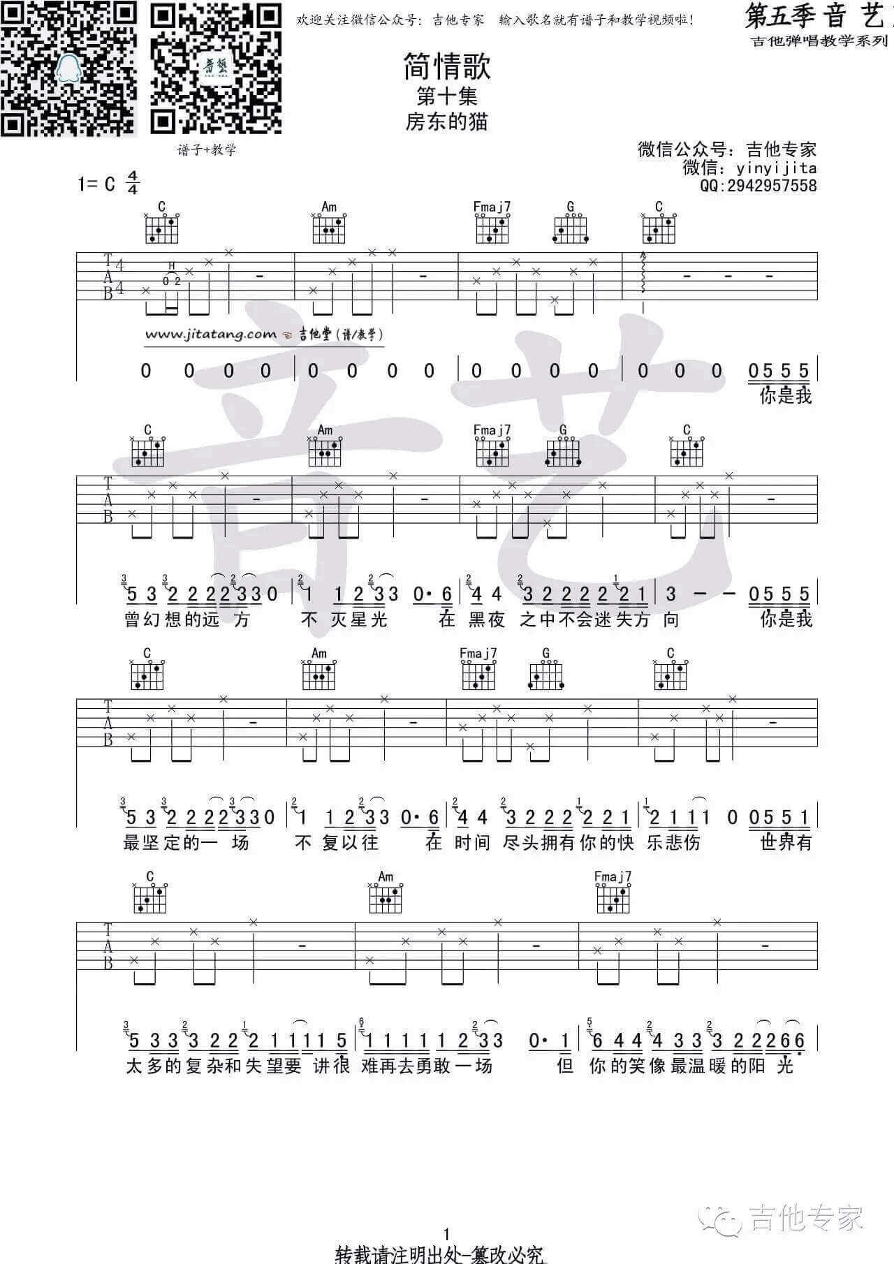 简情歌吉他谱 - 房东的猫 - C调吉他弹唱谱