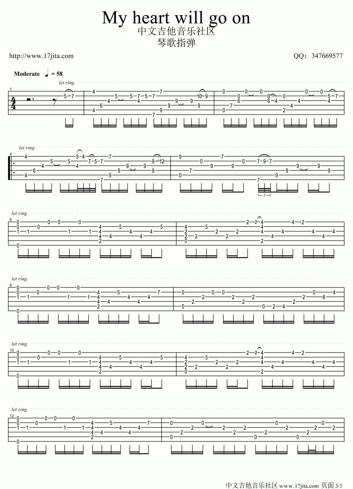 曲谱介绍: My《Myheartwillgoon》吉他独奏谱,共有3张高清图谱。