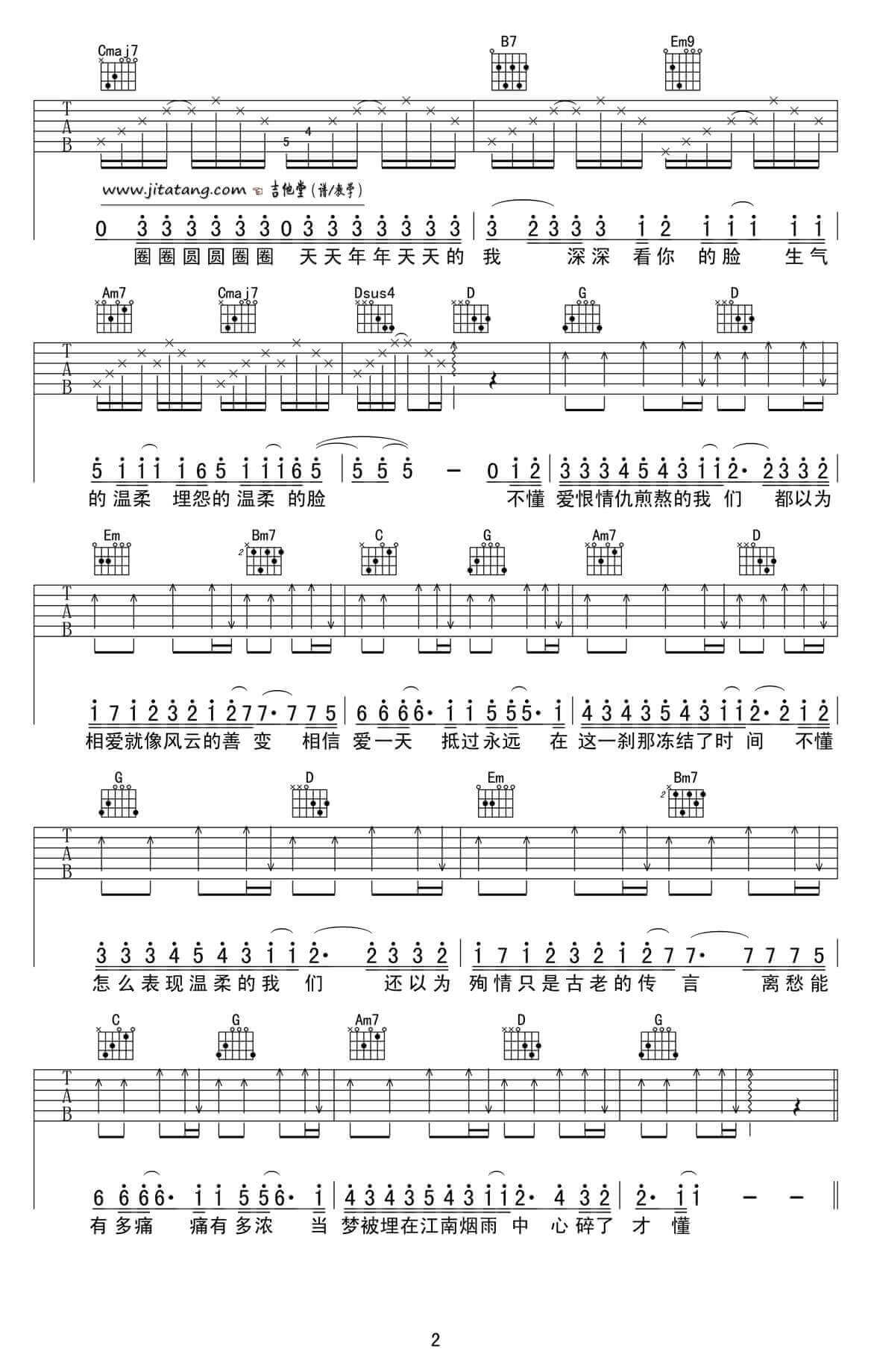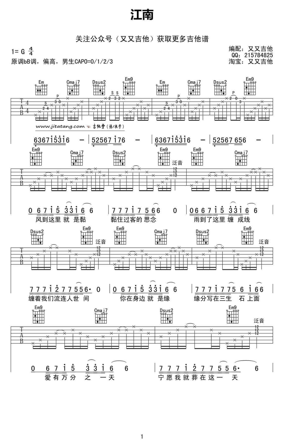 曲谱介绍: 江南吉他谱采用了G调指法,由又又吉他编配完成。《江南》这一首歌应该算是林俊杰的一个代表作了吧,只要我们提起这首歌的歌名,你就一定会想起林俊杰,而且,这首歌真的是深入人心了,只要前奏响起,我们就会想到是这首歌。2004年推出了这首专辑,红遍了大江南北,创造了近年来华语乐坛的一个奇迹,短短的时间内发片量就近百万张,这足以见到这首歌在当时的火爆程度了。TIPS:在这里向大家推介另外一首,它就是属于吉他谱啦,非常动听的一首曲子!