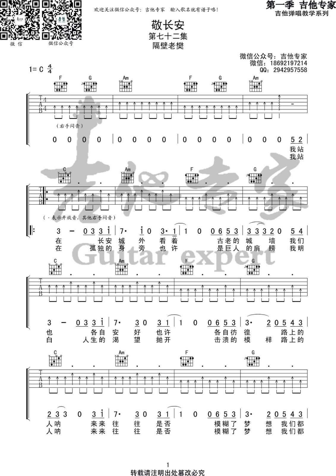 敬长安吉他谱 - 隔壁老樊 - C调吉他弹唱谱