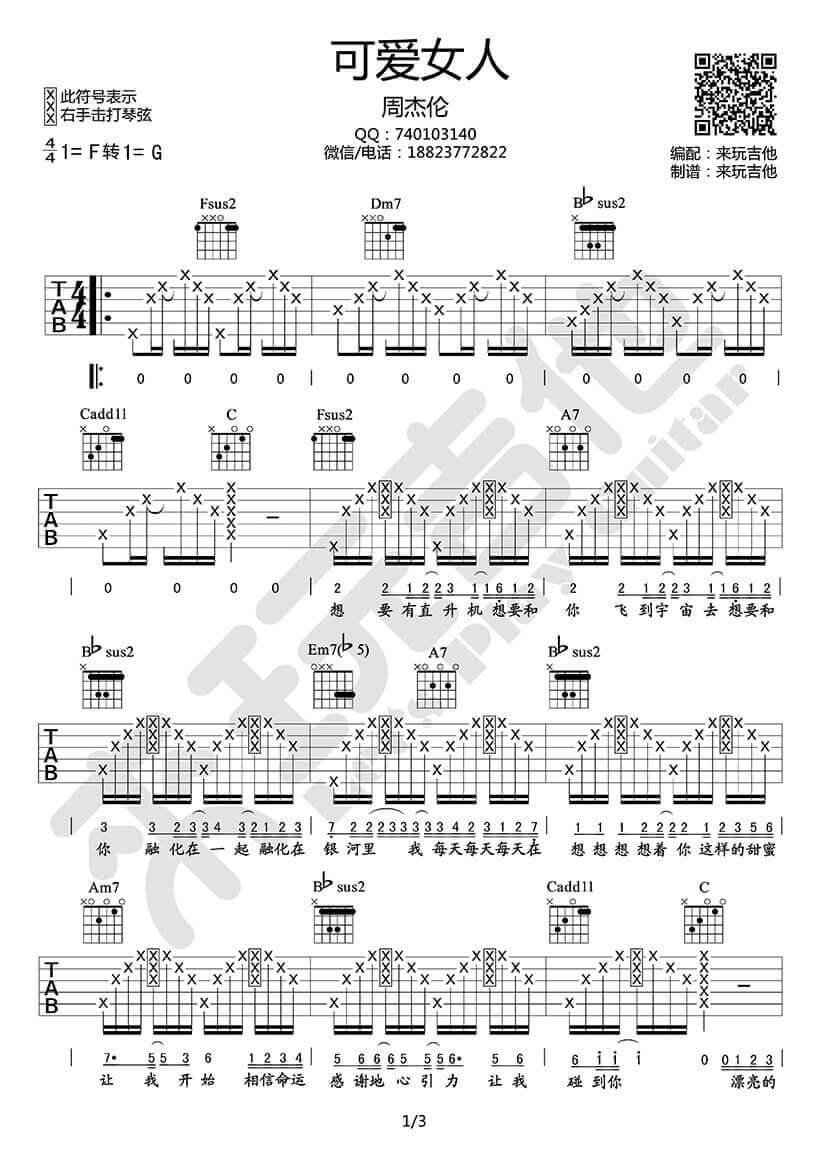 可爱女人吉他谱 - 周杰伦 - F调吉他弹唱谱