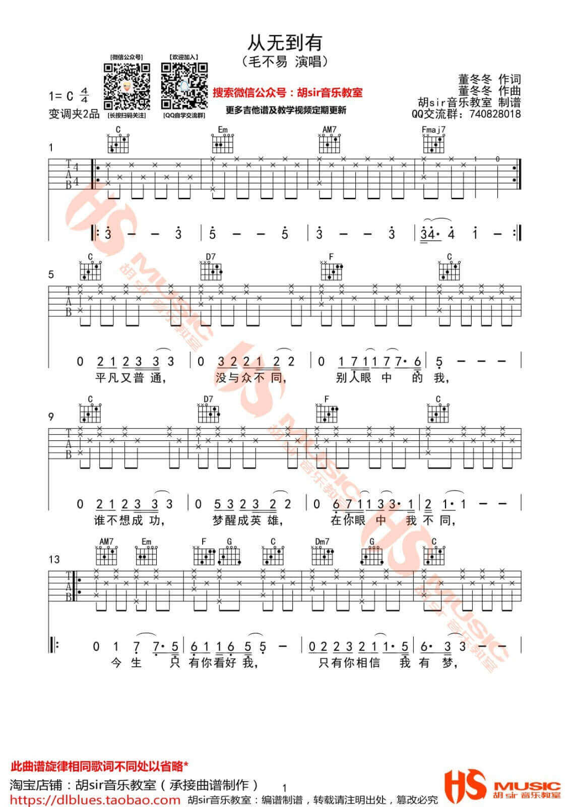 曲谱介绍: 从无到有吉他谱采用了C调指法,由胡sir吉他教室编配完成。听兄弟说,有梦可待吉他谱听了耳朵会怀孕,快快学起来,学完去撩妹!