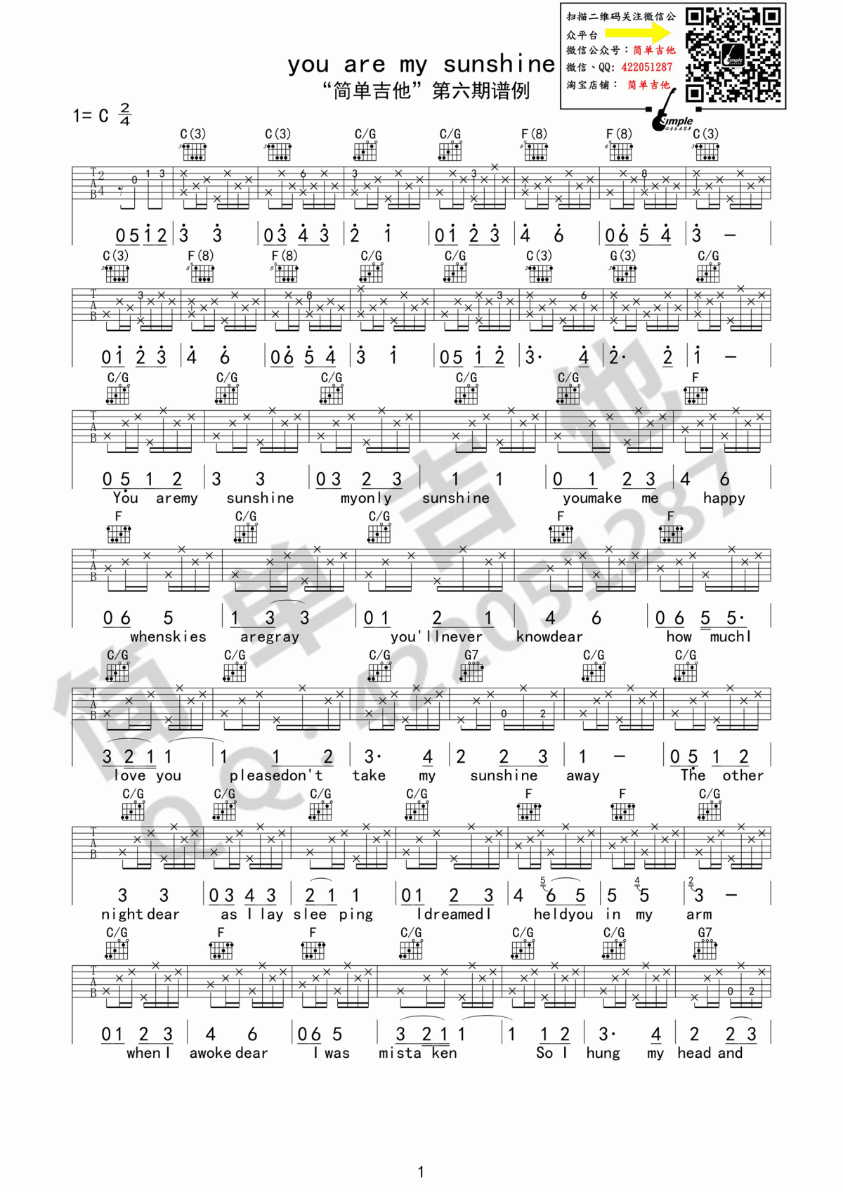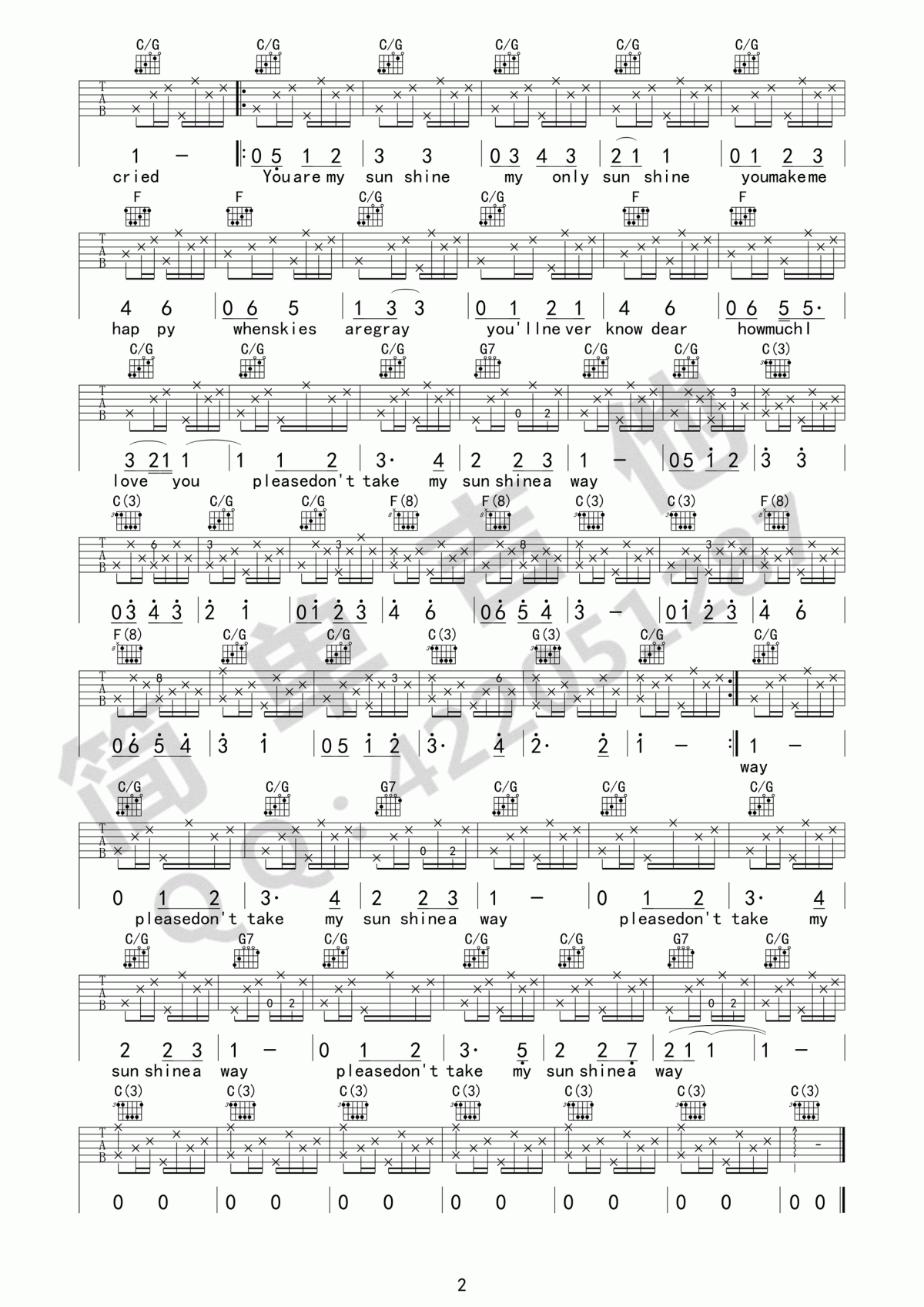 曲谱介绍: You《Youaremysunshine》吉他弹唱谱,采用C调指法编配原版,共有2张高清图谱,免翻页排版设计。