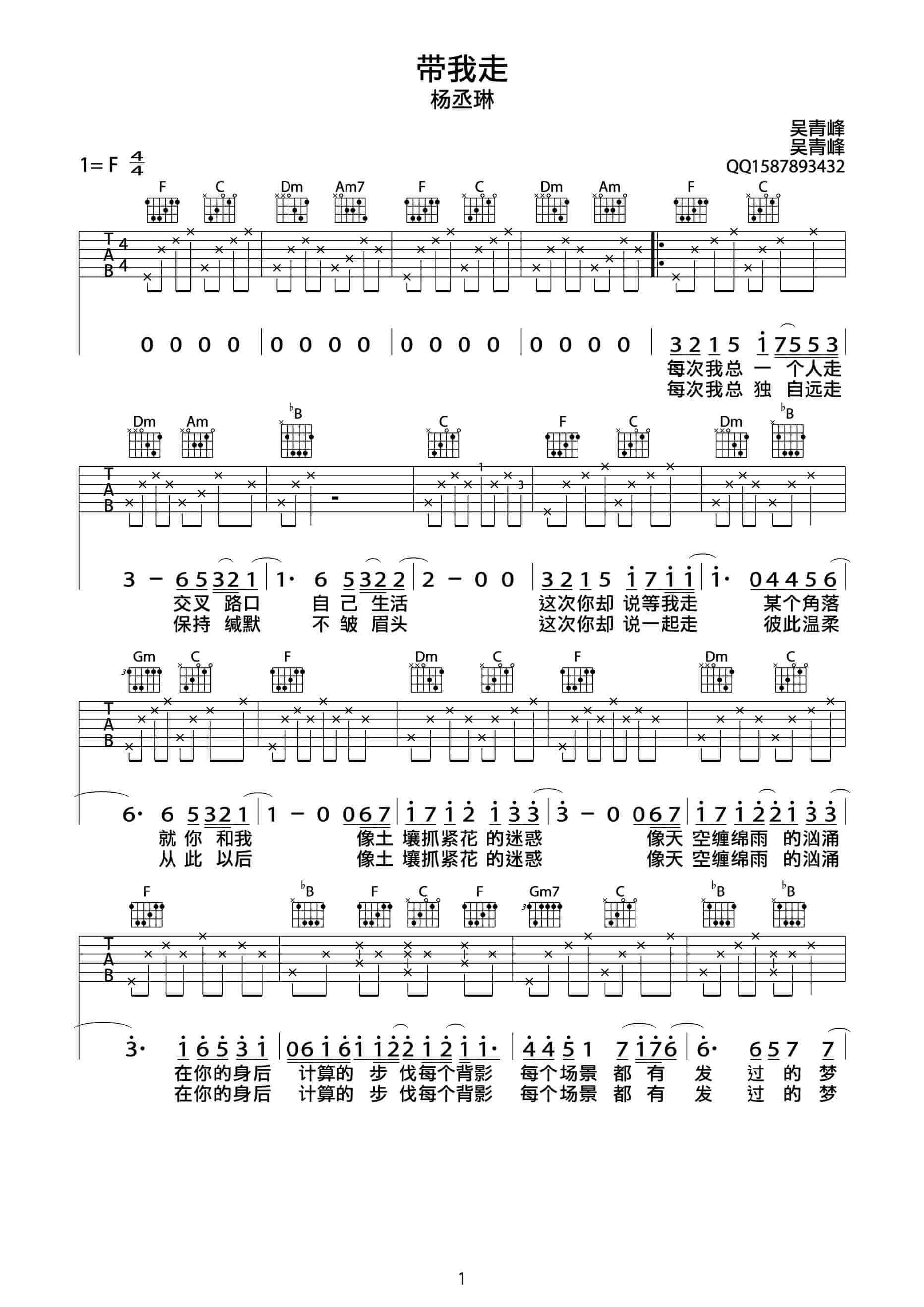 带我走吉他谱 - 杨丞琳 - F调吉他弹唱谱