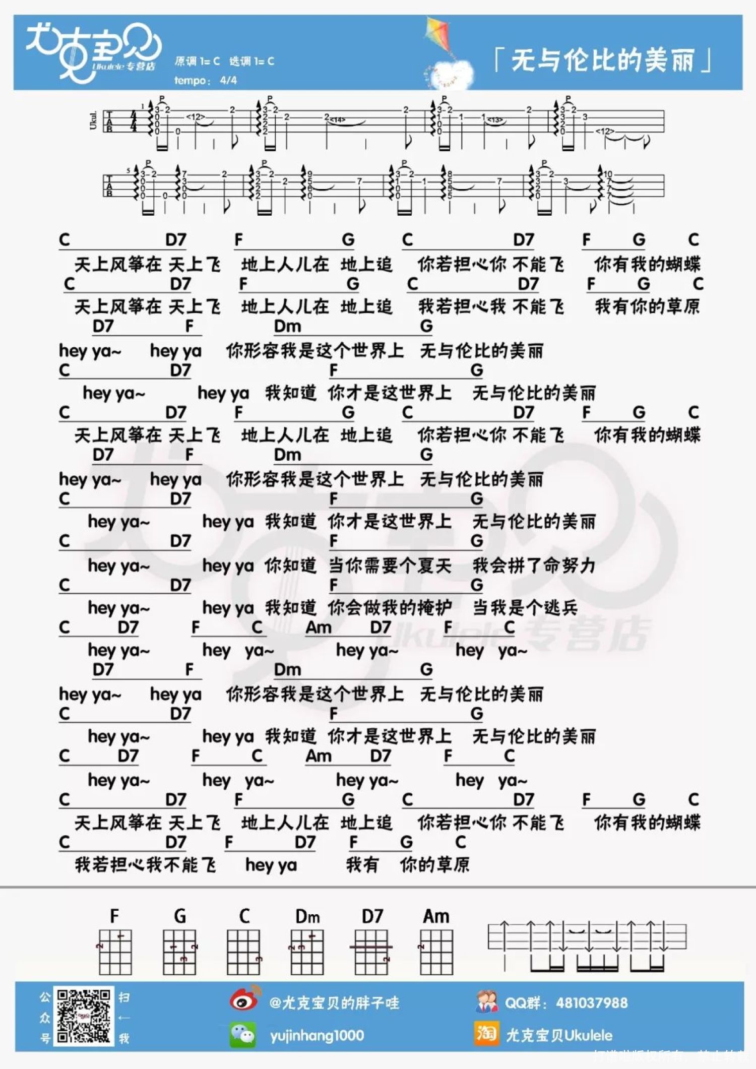 曲谱介绍: ● 这首歌也是吴青峰第98号创作,是吴青峰写给其闺密张悬的。两人超越爱情的友谊,谱写出这首不是情歌的情歌。 ● 《无与伦比的美丽》传达出的真诚, 歌曲中清新简单的音乐正在发生着不可思议的化学反应,无与伦比的美丽,沉浸在一种绵密而愉悦的温柔享受中。 「无与伦比的美丽」是我写给张悬的歌,写的是我跟他的故事。歌词引用了很多我跟他一来一往的简讯内容。他在我站上了海洋音乐祭的大舞台前告诉我,他的夏天过的很糟,希望我能够为他过一个很棒的夏天。 我在写这首歌的时候,想到了我们开始建立深厚感情的那年夏天。那时候我们还没有很熟,可是在往来的简讯中,她知道我很不好,竟然马上从士林赶来信义路找我,那时候我趁着酒意和悲伤,在大街上狂奔哭泣,就像自己是一个逃兵,想要逃离一切悲伤,只有她在后面紧紧追着我,为我挡去很多不必要的人。那年夏天,和那个晚上对我来说很重要,我永远不会忘记她跟我在街上奔跑,喘息和哭泣的模样。从那之后,夏天就变成了我们的密语,只有我们知道代表着什么意义。   尤克里里弹唱演示 TIPS: 来自子哇和《最强音》福师大李怡良同学合作的「无与伦比的美丽」。   弹唱教学   弹唱曲谱