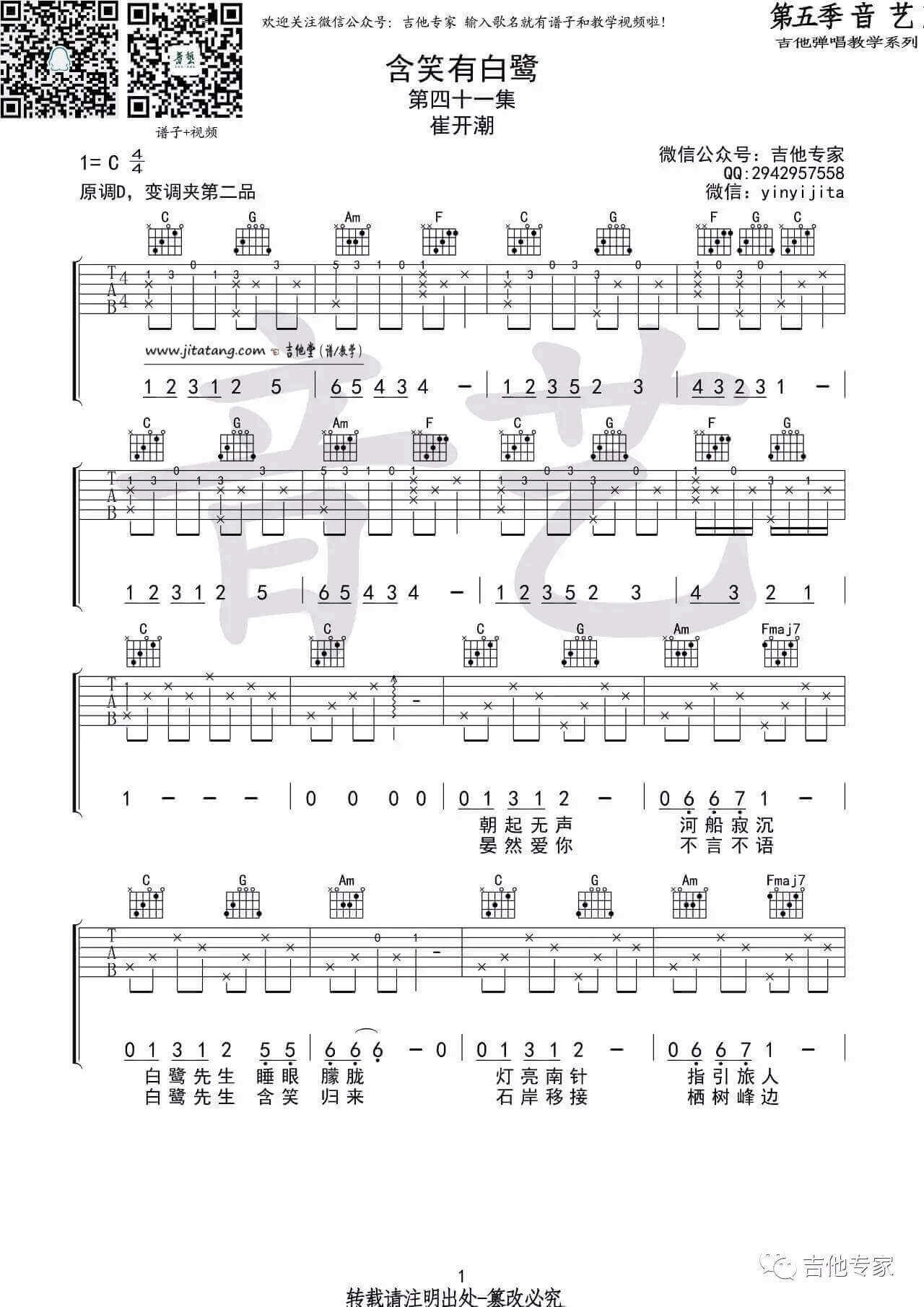 曲谱介绍: 含笑有白鹭吉他谱采用了C调指法,由音艺吉他编配完成。重要提示:长安县吉他谱更新啦,学完这首后,顺便把下首学了吧。