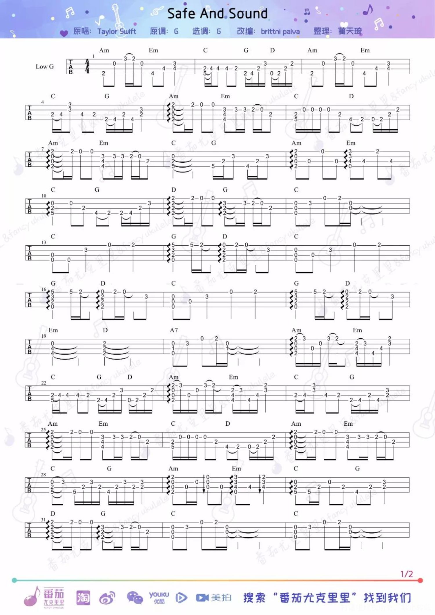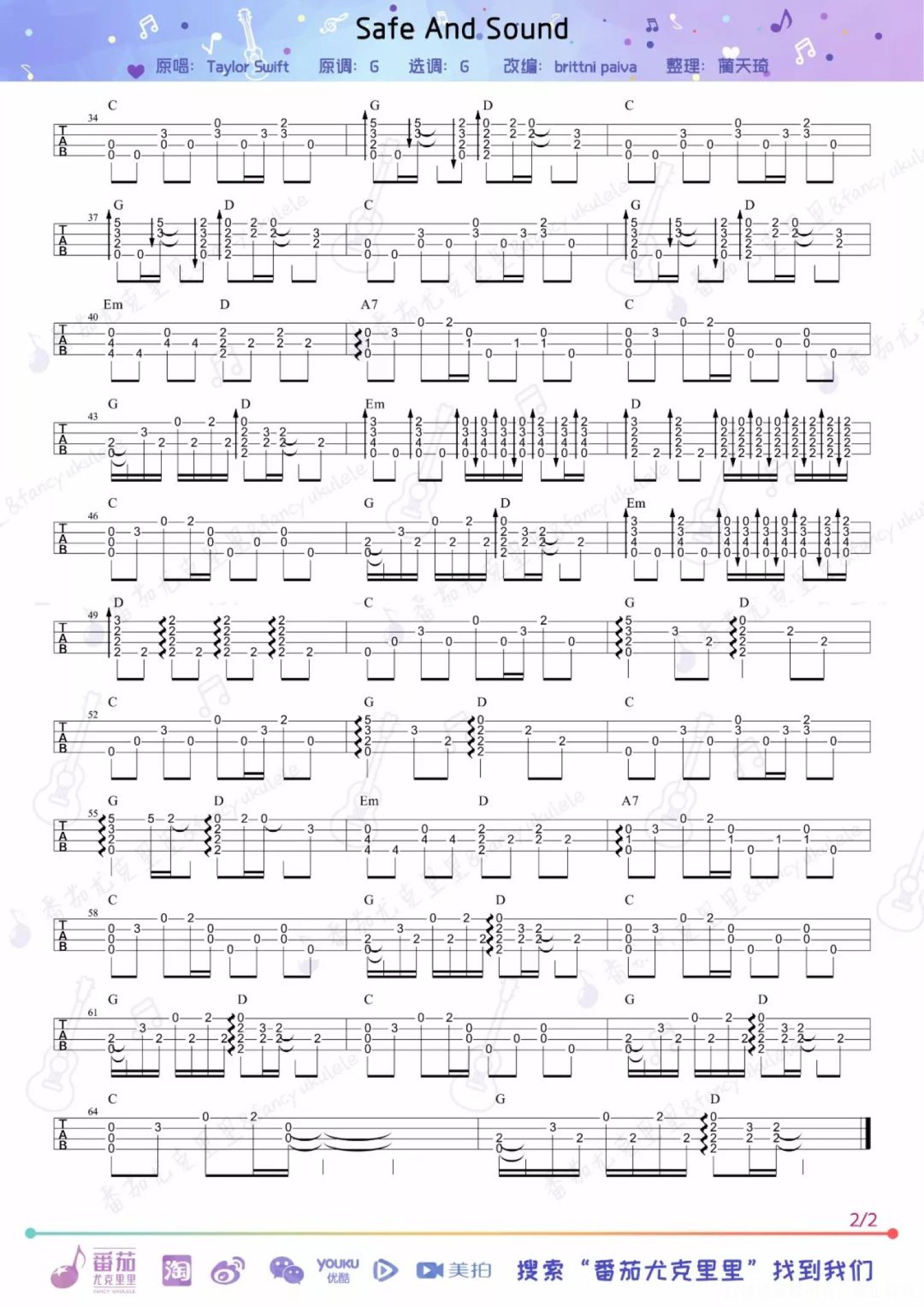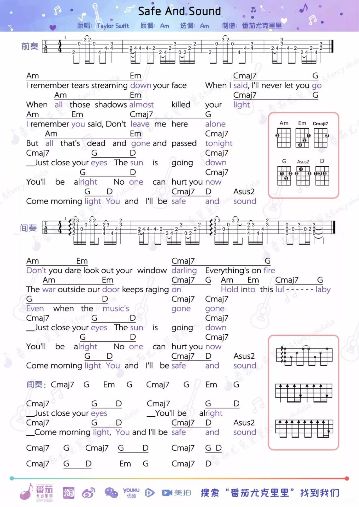 曲谱介绍: 无论是黑化前的Taylor 还是黑化后的真·霉霉 歌曲依旧还是很好听~ 你的taylor入坑曲是它吗?   《Safe And Sound》尤克里里&吉他指弹 cover by:蔺&柿子   《Safe And Sound》尤克里里指弹   教学视频 1、part one   2、part two   尤克里里指弹谱   尤克里里弹唱谱