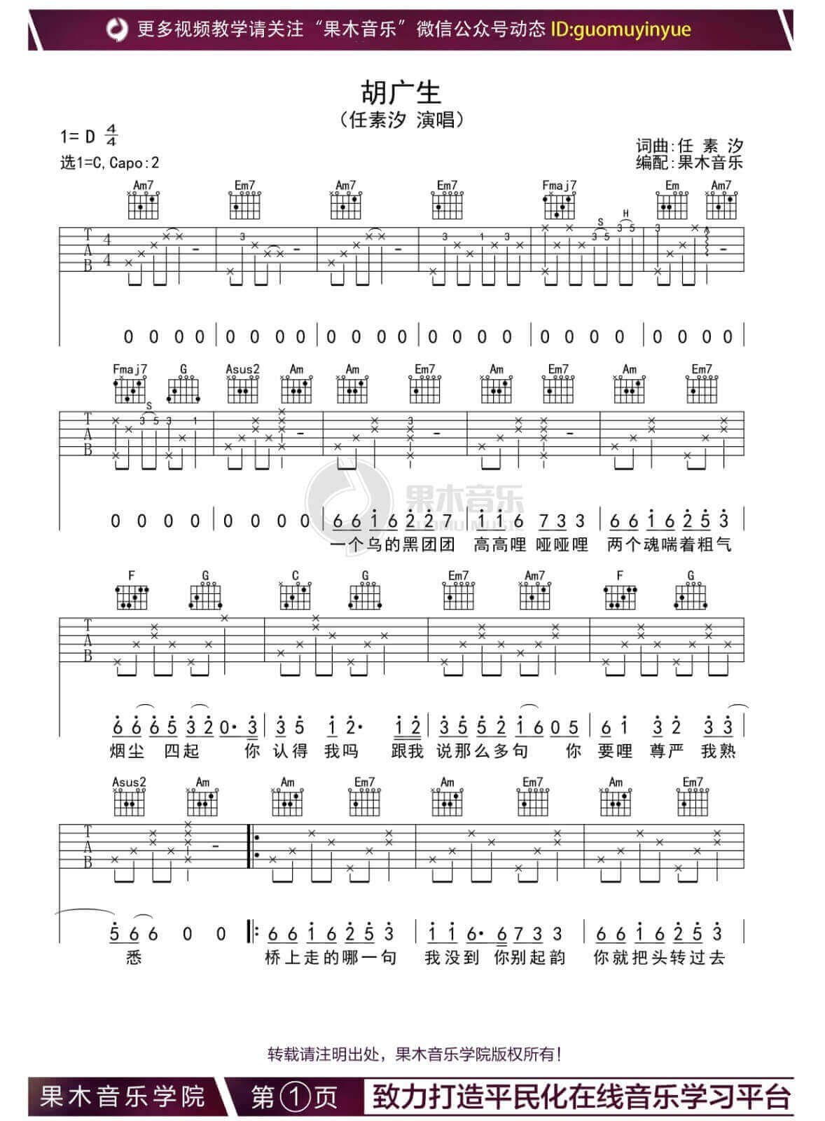 胡广生吉他谱 - 任素汐 - C调吉他弹唱谱