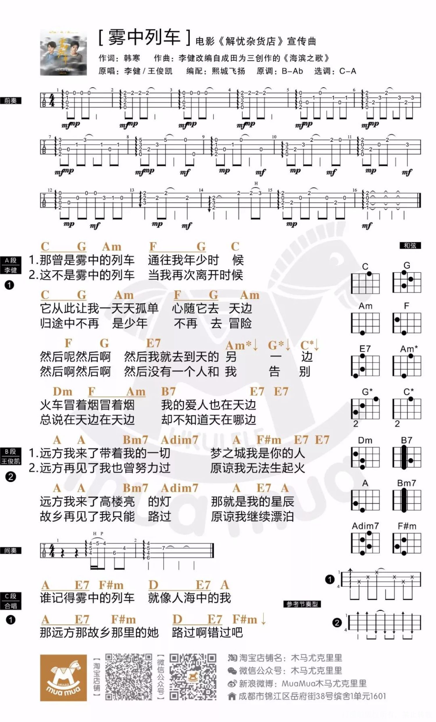 曲谱介绍: “李健+王俊凯”为你解忧 谁还记得《雾中列车》 铃铛响起,解忧老爷爷开启了时光大门 那个拥有神秘色彩杂货店,蕴藏着岁月的沧桑 李健温润的嗓音富有磁性,全情投入,画面感十足 王俊凯眼神温柔,嗓音低沉而优雅,侧颜杀帅气十足 每个故事少年蜕变成两鬓斑白的老者,你又是否会归来 列车渐行渐远,沿路的风景,便是最好的答案   Ukulele版编曲:原曲是B调转Ab调,考虑到两个调的尤克里里指法都过于复杂,所以选调升半音的C转A,男生如果实在唱不上去李健部分,可以选择琴降半音调弦,有B型琴的也可以直接变调夹夹4品唱原调,女生可以直接唱或者使用变调夹进行升调;在和弦进行上,要注意有*号的部分,在那里是采用了和弦的特殊指法; 另外一个值得注意的地方是,王俊凯演唱的部分是引用了成田为三的《海滨之歌》的旋律,原曲是3/4拍的曲子,在这个版本里,唱的是4/4拍的节奏。   雾中列车Ukulele版前奏演示(B型琴4品)   雾中列车尤克里里谱   经典原版《海滨之歌》 海滨之歌 Ukulele弹唱版by飞扬   海滨之歌 尤克里里谱