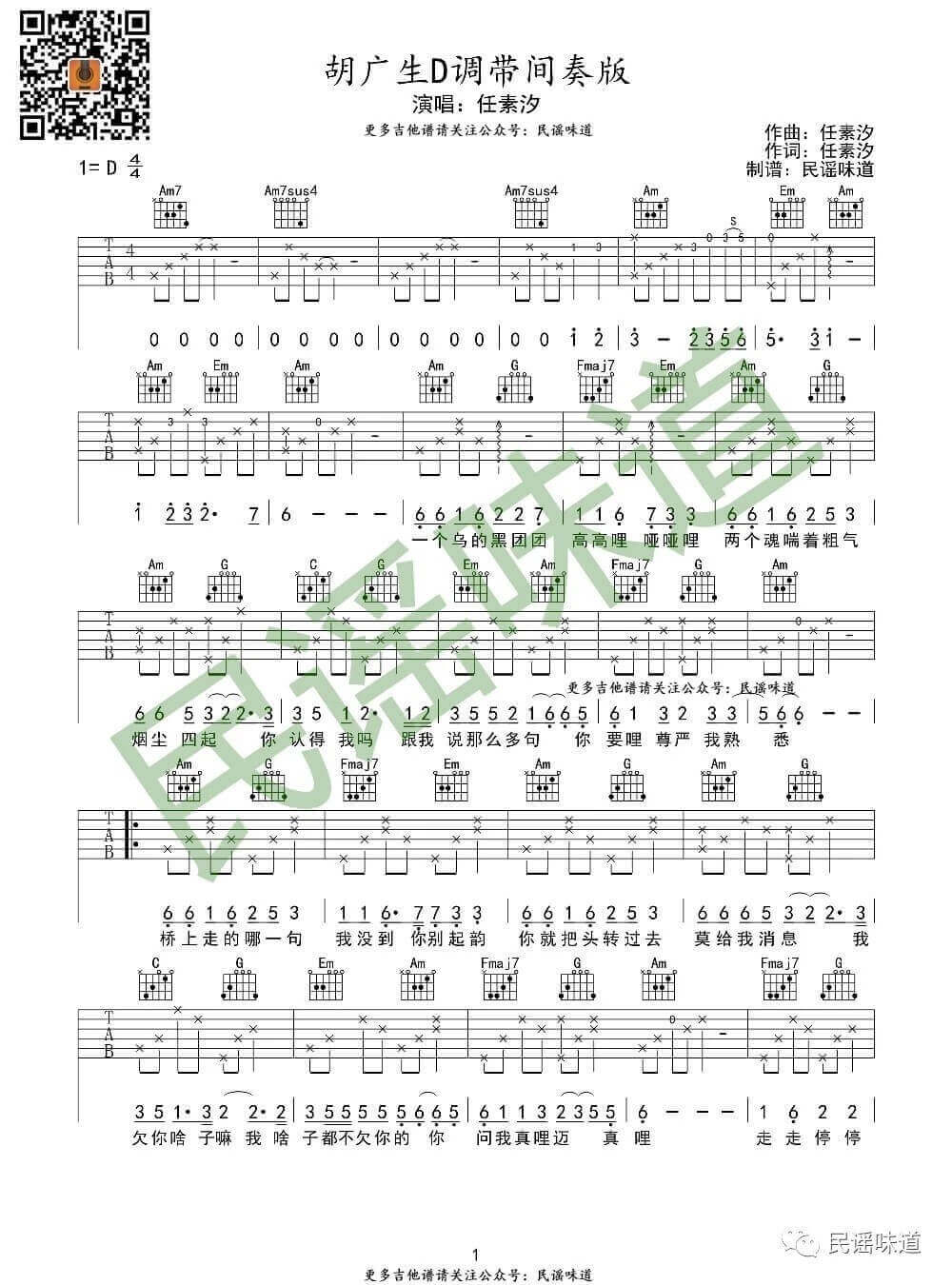 胡广生吉他谱 - 任素汐 - D调吉他弹唱谱