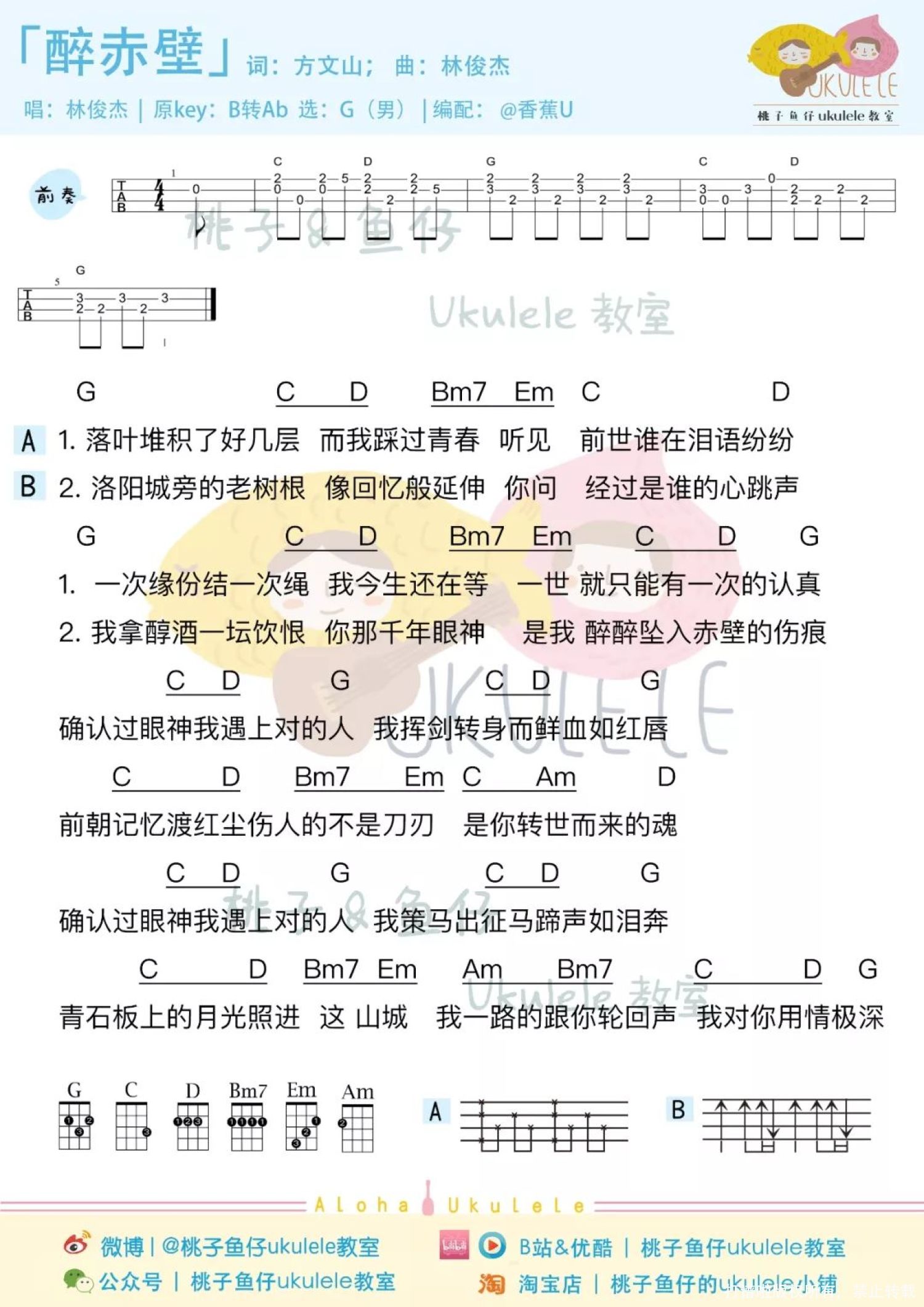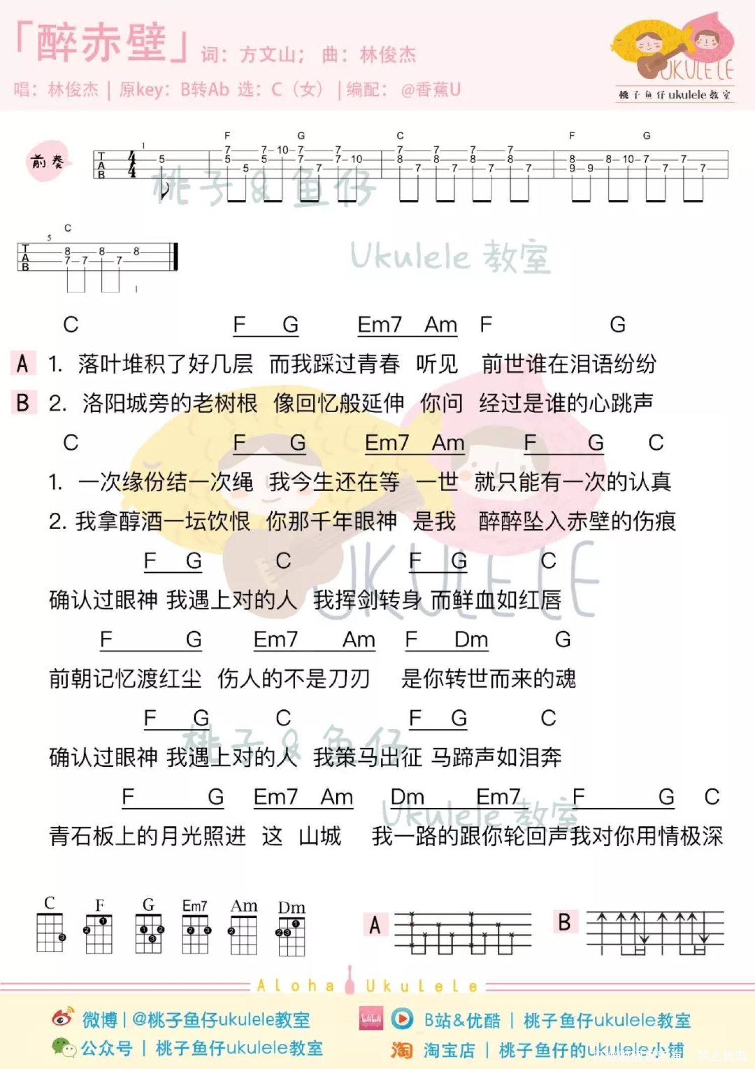 曲谱介绍: 尤克里里弹唱教学   醉赤壁 尤克里里谱 1、女声版 2、男声版