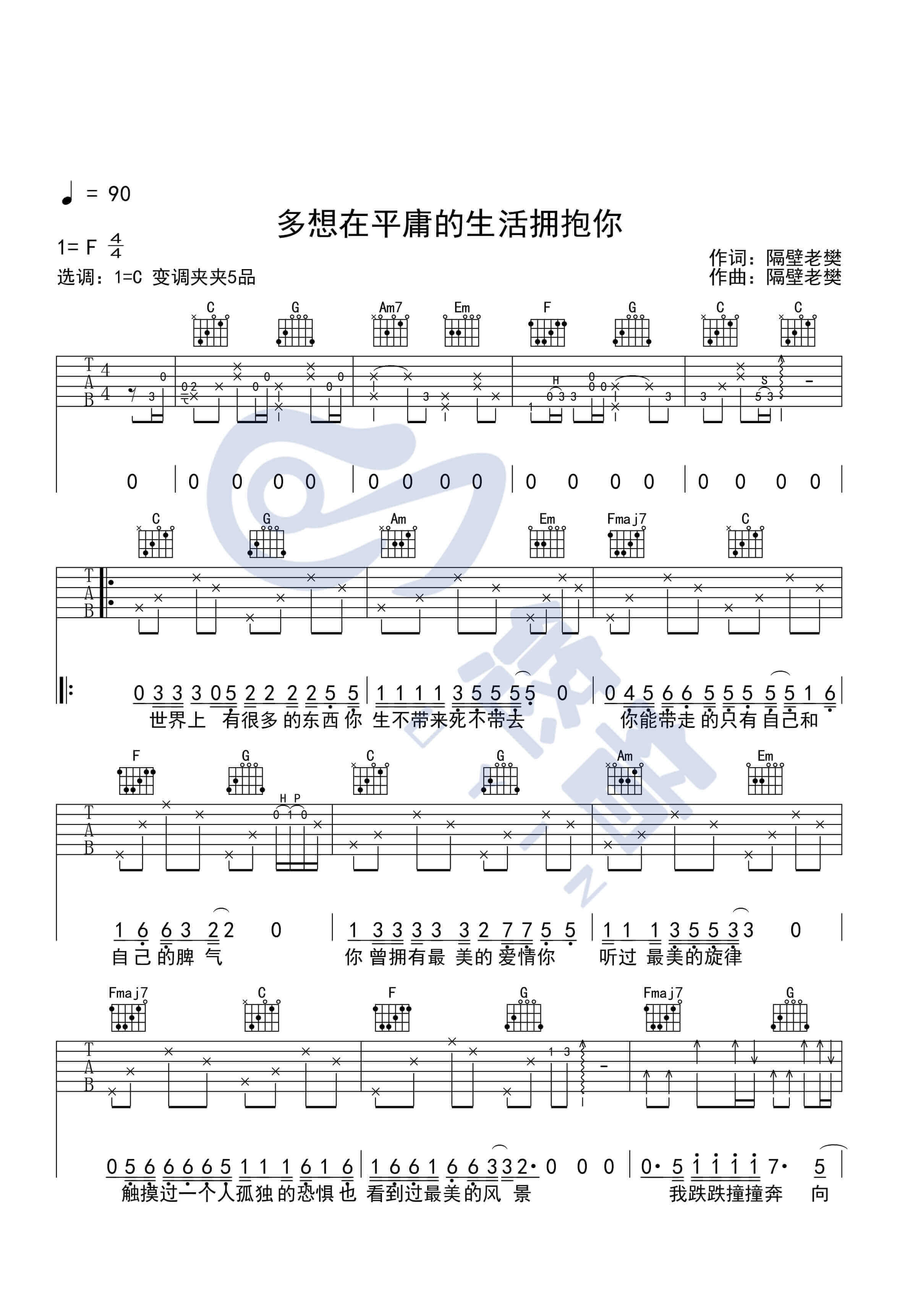 多想在平庸的生活拥抱你吉他谱 - 隔壁老樊 - C调吉他弹唱谱