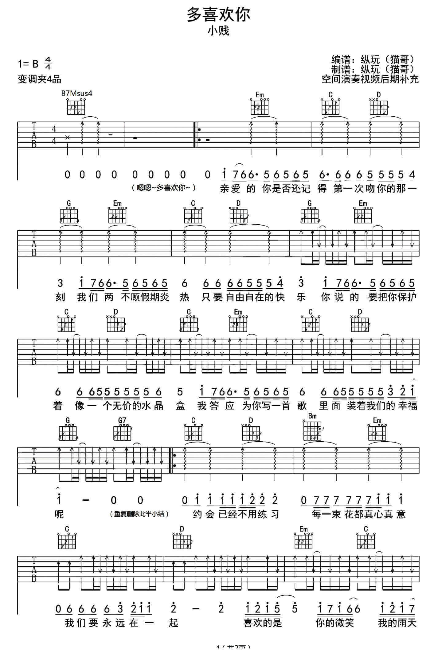 多喜欢你吉他谱 - 小贱 - B调吉他弹唱谱
