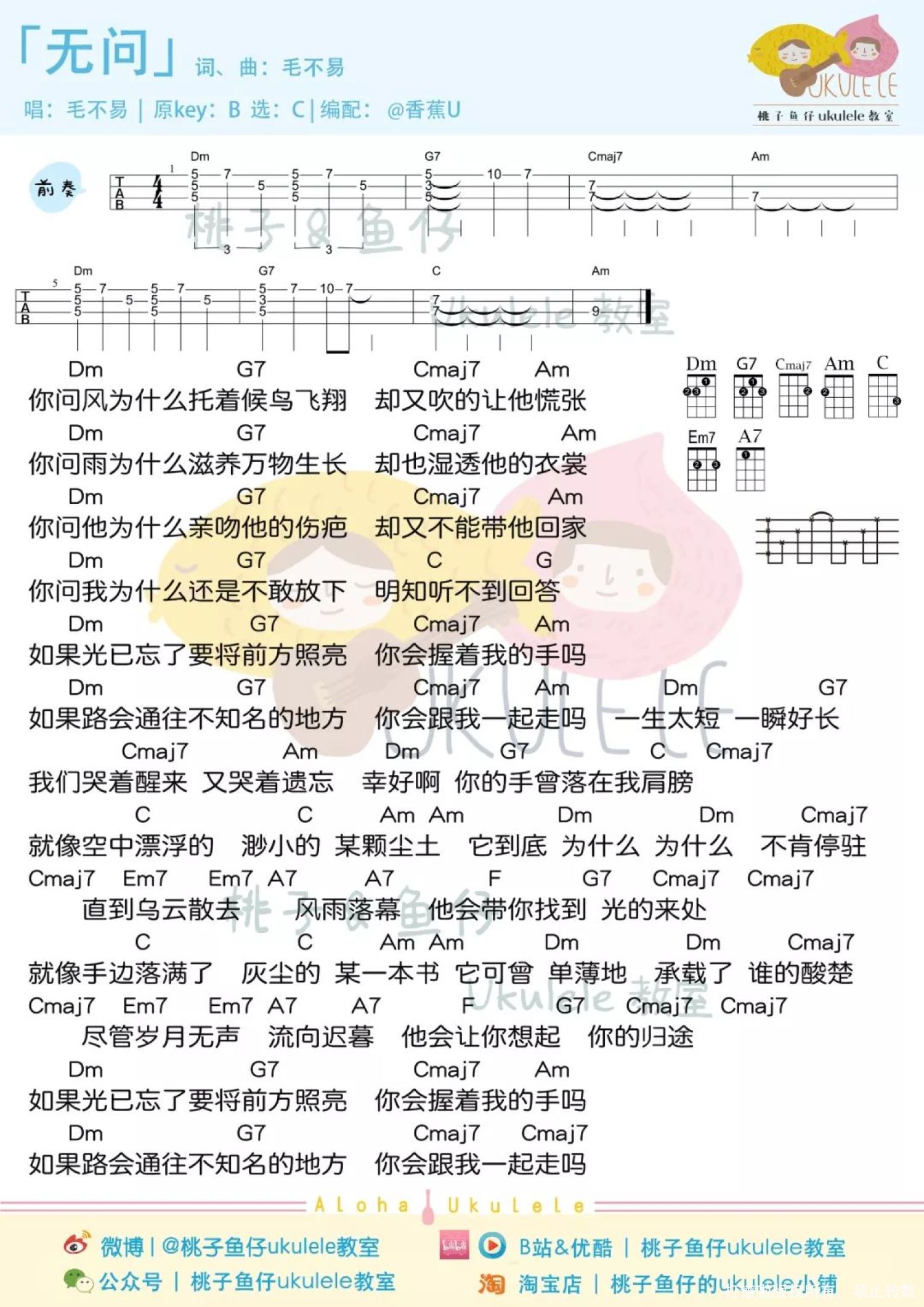曲谱介绍: 毛不易发新歌了,这次是为电影《无问西东》全新创作的宣传曲——《无问》。 一生太短,一瞬太长。 字字戳心,一首歌道出了一生。 《无问》尤克里里弹唱谱