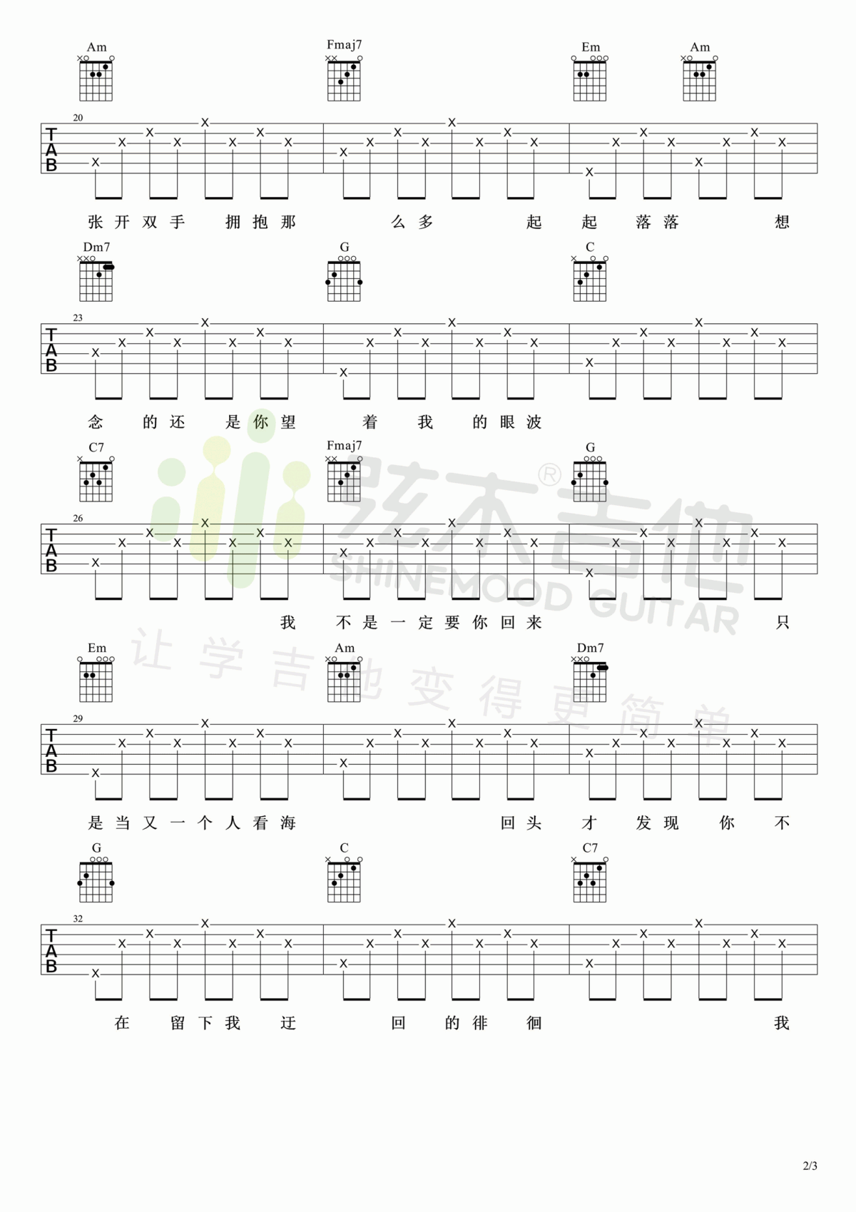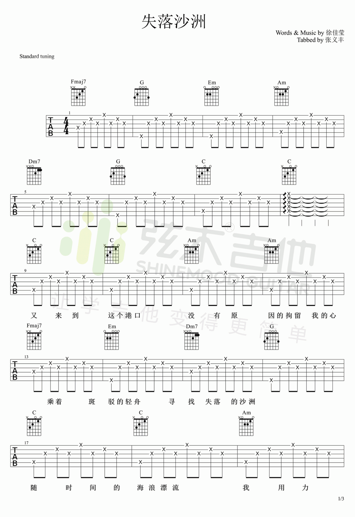 曲谱介绍: 徐佳莹《失落沙洲》吉他弹唱谱,采用C调指法编配,共有3张高清图谱。