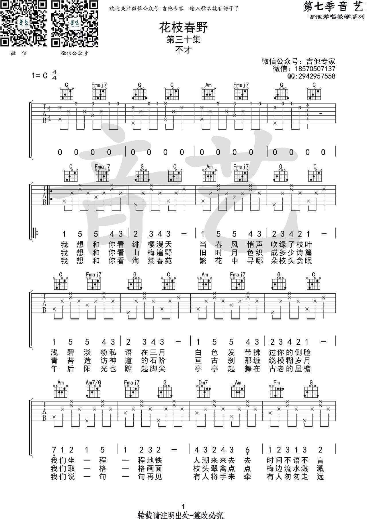 花枝春野吉他谱 - 不才 - C调吉他弹唱谱