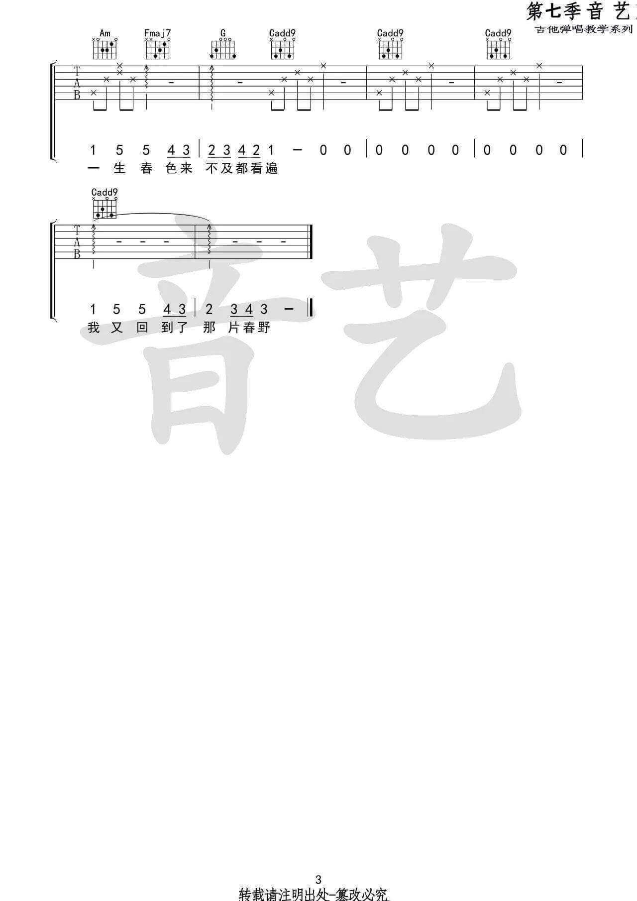 曲谱介绍: 花枝春野吉他谱采用了C调指法,有音艺吉他编配完成。《花枝春野》这是一首十分治愈的歌曲,春天的田野一片绿油油的,我想和你一起去看,一起去感受春天的浪漫,一起分享我的快乐,这一首歌曲娓娓动听的旋律,搭配歌手温柔的声线更将这首歌治愈的感觉演绎得淋漓尽致。另外,这首身骑白马吉他谱也超级好听,小伙伴们有福啦,还不去练起来?