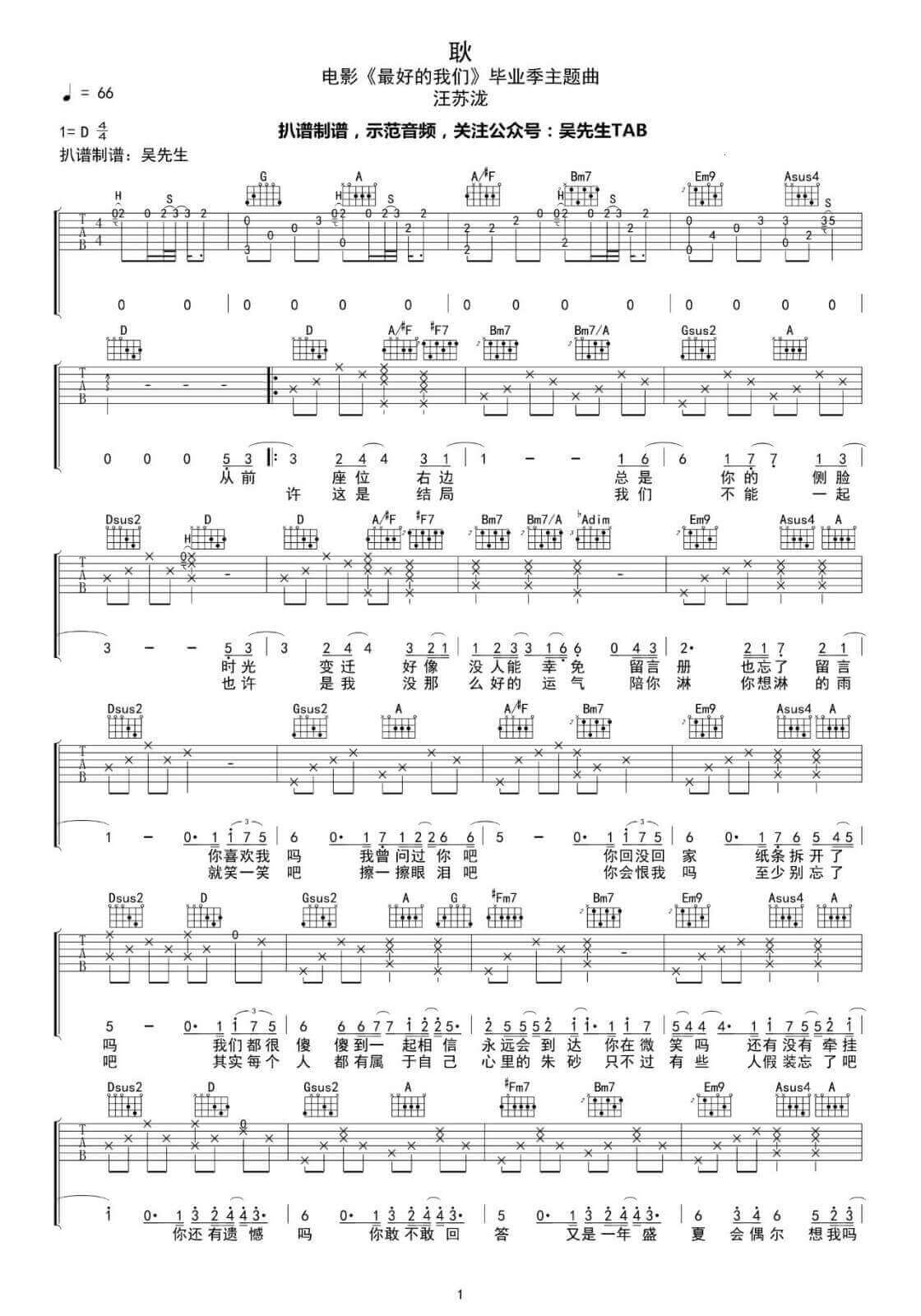 耿吉他谱 - 汪苏泷 - D调吉他弹唱谱 - 原版