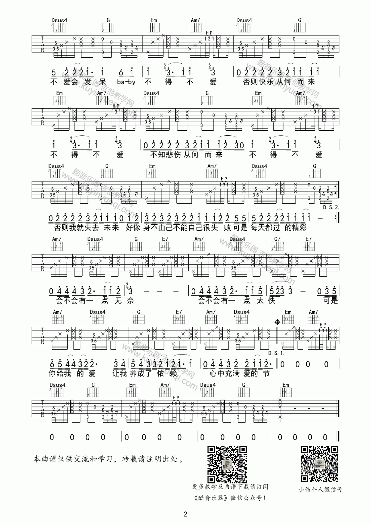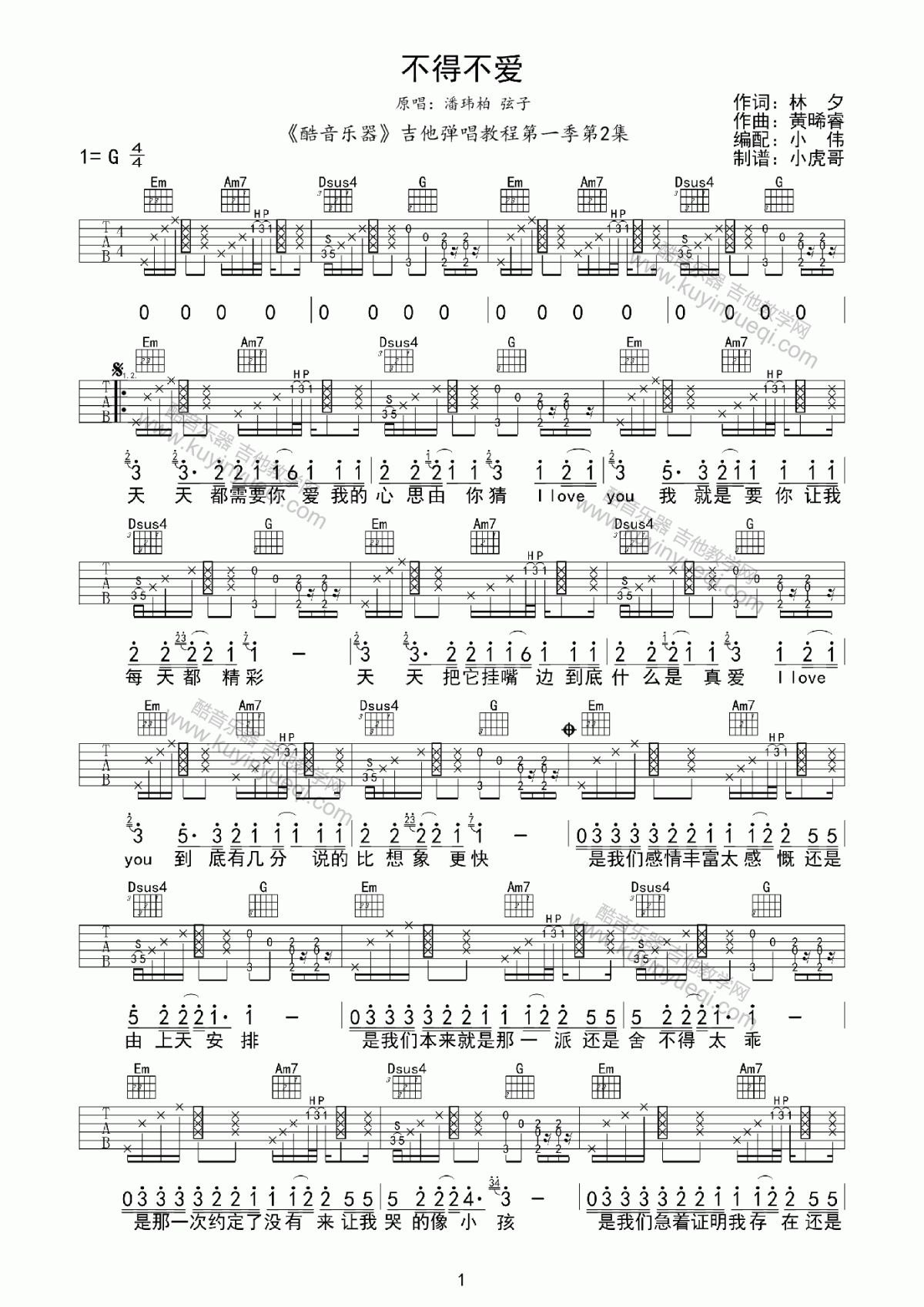 曲谱介绍: 《不得不爱》吉他弹唱谱,采用G调指法编配,共有2张高清图谱,免翻页排版设计。