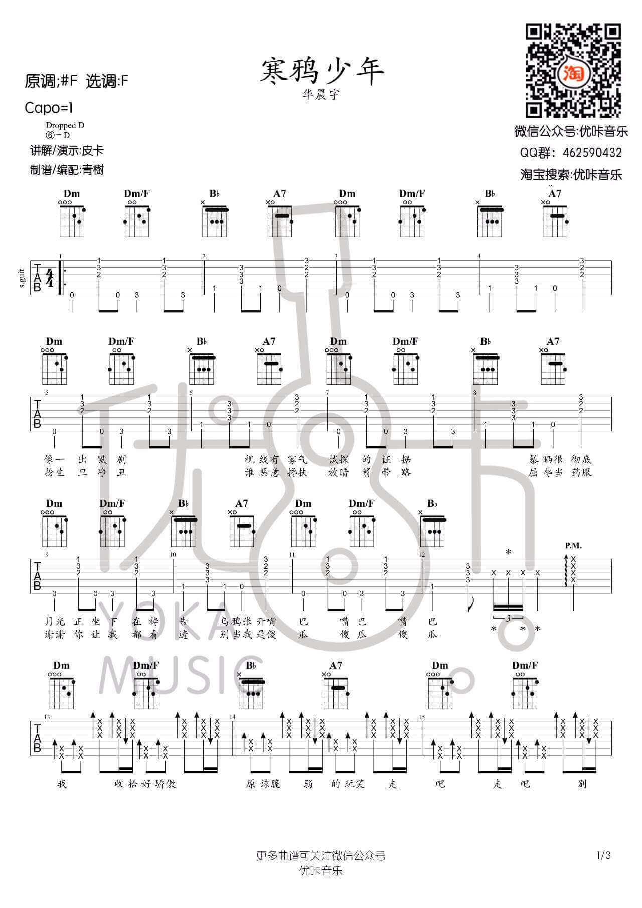 曲谱介绍: 寒鸦少年吉他谱采用了D调指法,由优咔音乐编配完成。《寒鸦少年》是电视剧斗破苍穹的主题曲,一位意气风发的少年身上背着剑在江湖中行走一般,不畏惧任何事情,勇于在江湖中行走,仗剑走天涯。歌里走吧走吧,唱出其中的洒脱与自由。这首着魔吉他谱也很帅,快点去学习吧,没学会的小伙伴要继续加油喔,稳! <iframe src="https://v.qq.com/txp/iframe/player.html?vid=e0724unn45v" width="880"</iframe> 吉他弹唱演示及视频教学 <iframe src="https://v.qq.com/txp/iframe/player.html?vid=e0724unn45v" width="880"</iframe> 吉他弹唱演示及视频教学