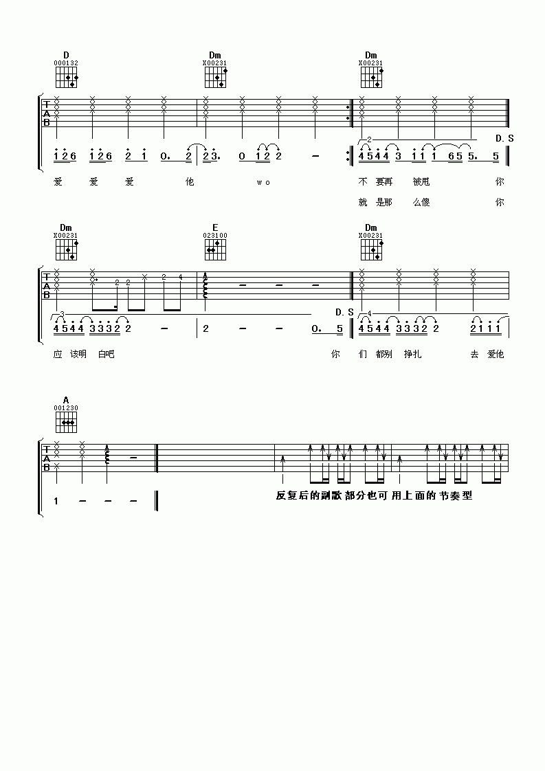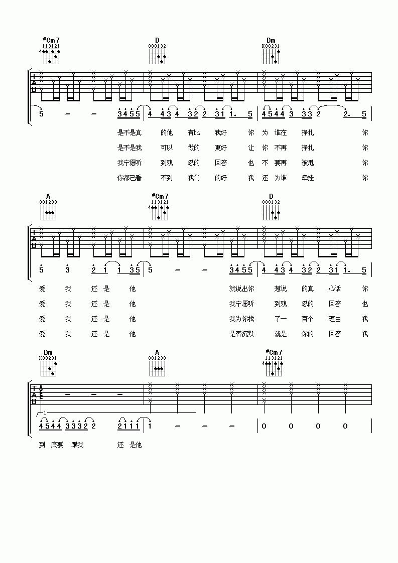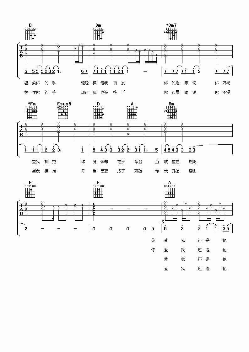 曲谱介绍: 《陶喆,爱我还是他》吉他弹唱谱,共有4张高清图谱。