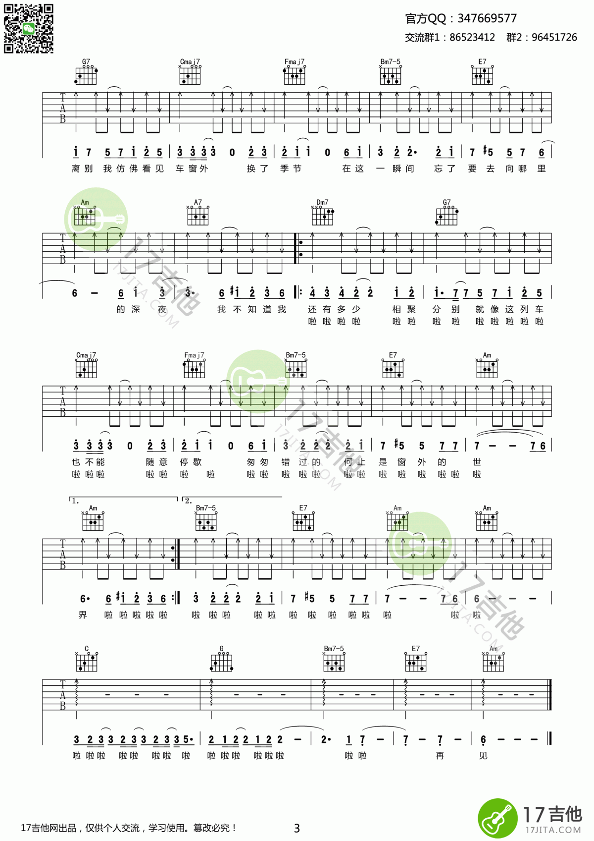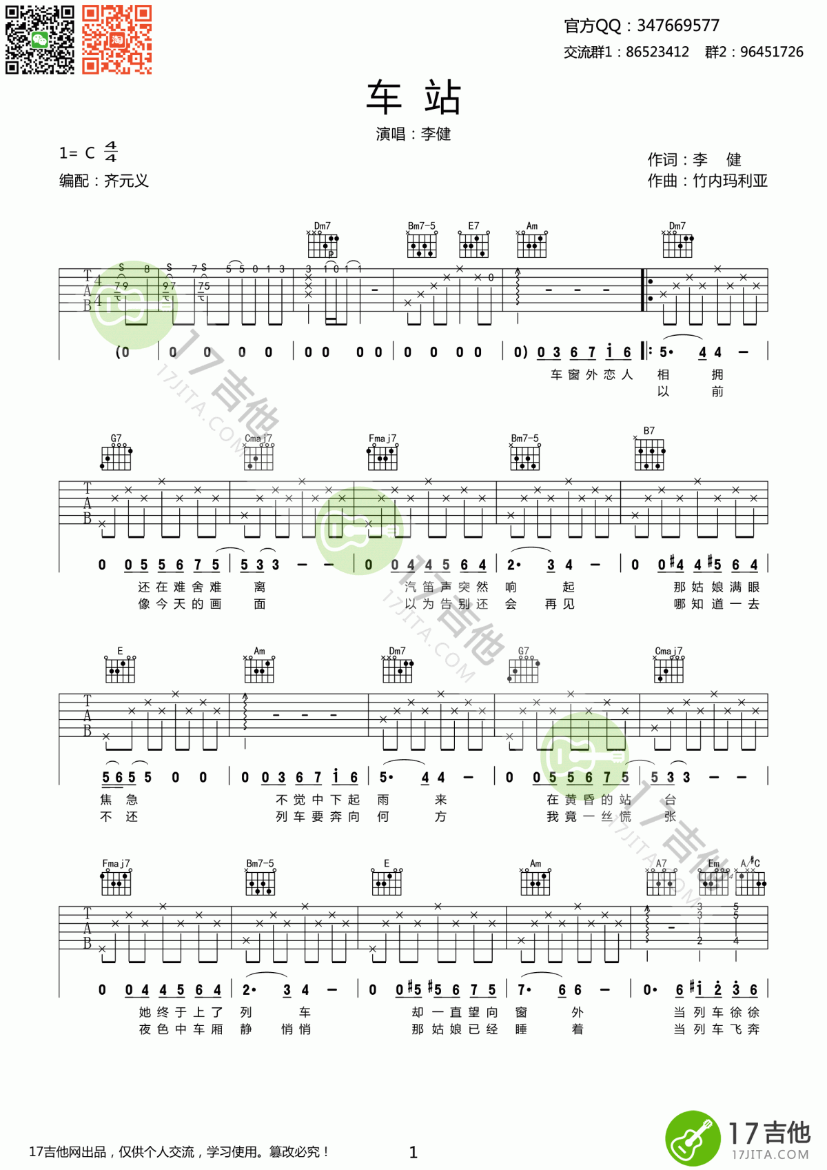 曲谱介绍: 李健《车站》吉他弹唱谱,采用C调指法编配,共有3张高清图谱。