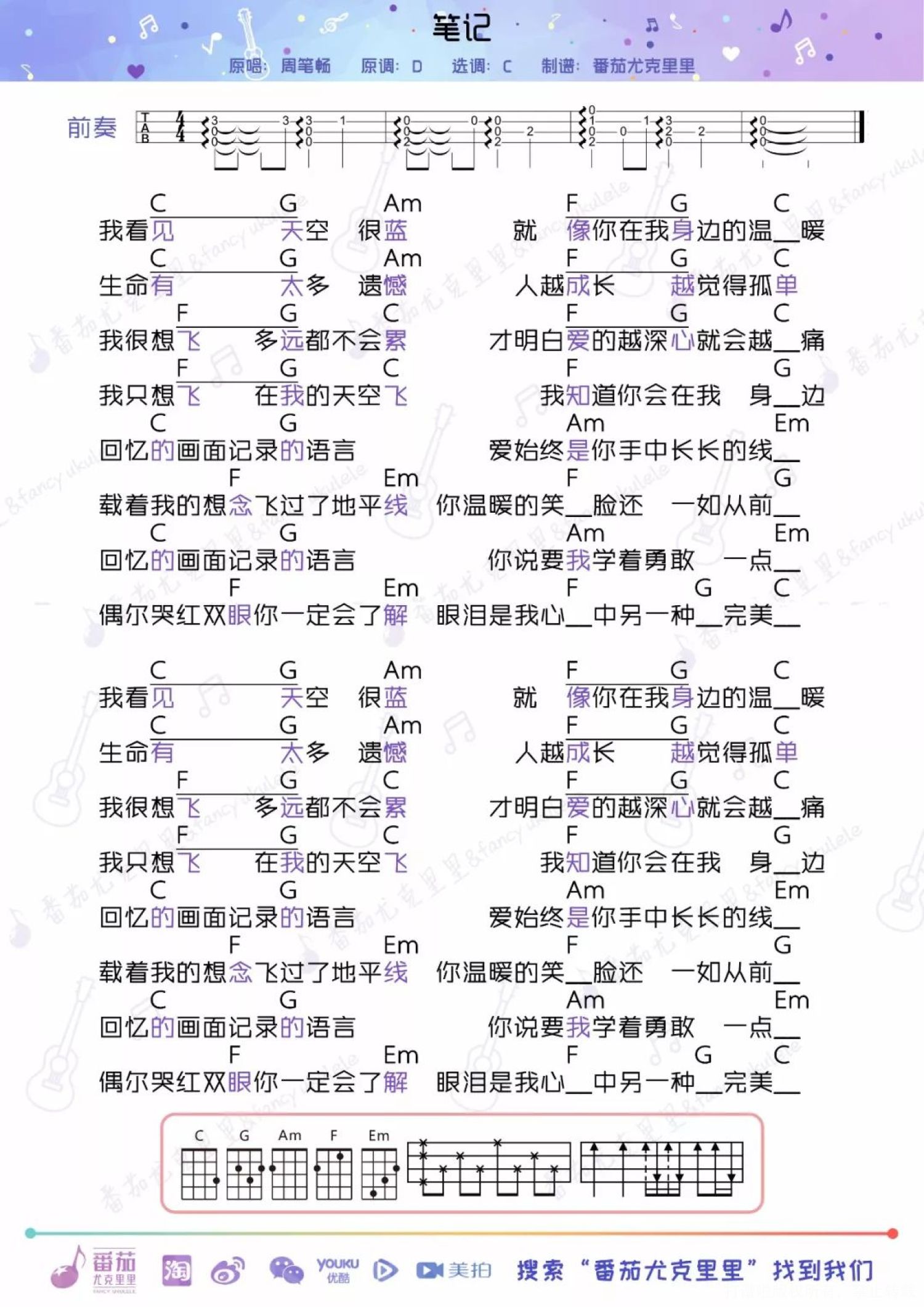 曲谱介绍: 《笔记》尤克里里谱 简单的歌词与旋律 却被周笔畅温暖的声线升华的格外动听。 歌曲中诉说的青春迷惘、梦想张扬的故事 充溢的自然温暖、轻快明丽的旋律 使这首歌不仅成为歌颂青春、铭记成长的歌曲 也是一首能唱给妈妈,抒发对母爱赞美的作品。