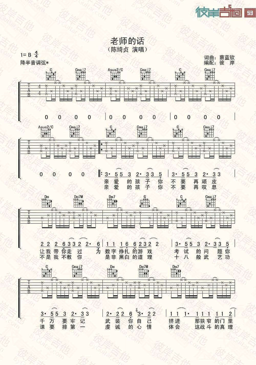 曲谱介绍: 老师的话吉他谱采用了B调指法,由彼岸吉他编配完成。和这首一样赞的像叶子一样飞吉他谱也非常NICE,大家快去学习吧!