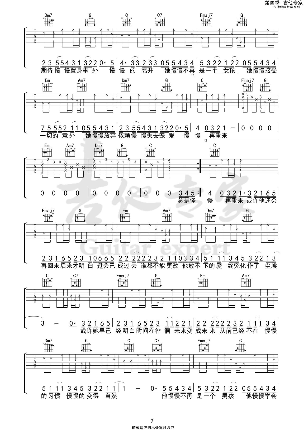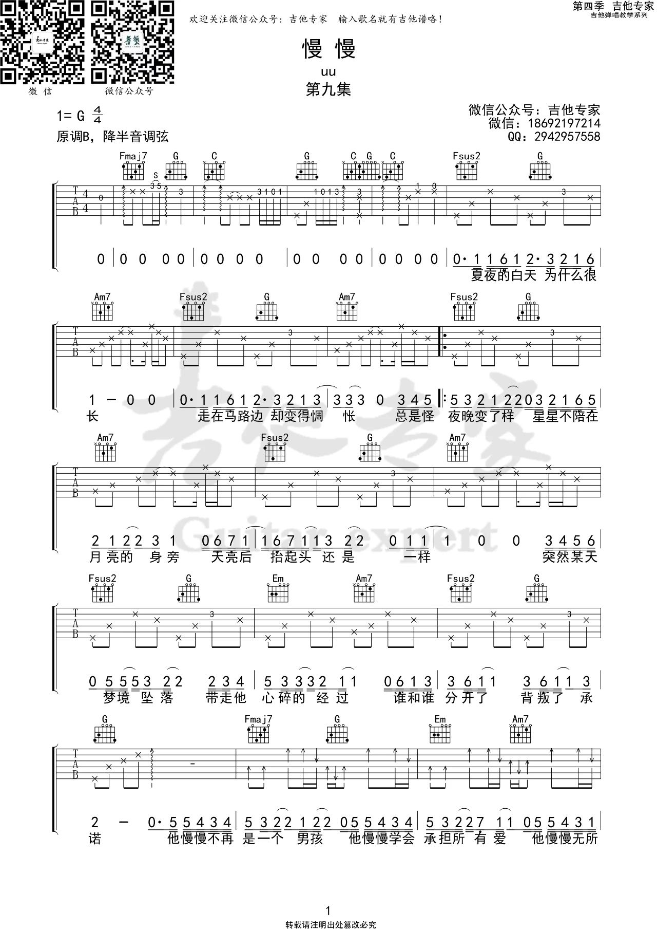 曲谱介绍: 曲谱说明:来自吉他专家编配「慢慢」吉他谱,本谱采用C调和弦指法编配,演奏建议变调夹夹-1品,也可以根据个人音域找到一个适合自己的位置,难度一般。喜欢这首歌的朋友拿起吉他一起练起来吧,有任何问题请留言讨论。
