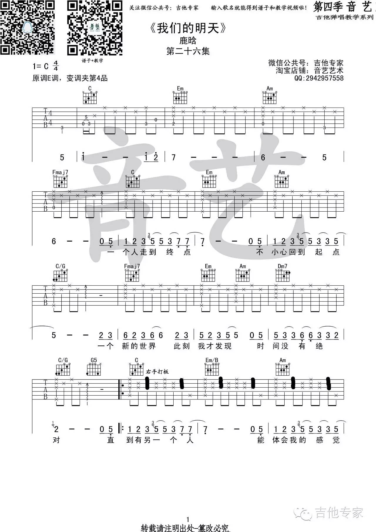 我们的明天吉他谱 - 鹿晗 - C调吉他弹唱谱