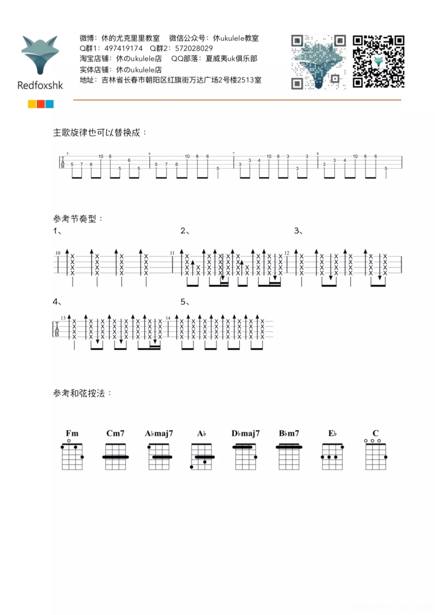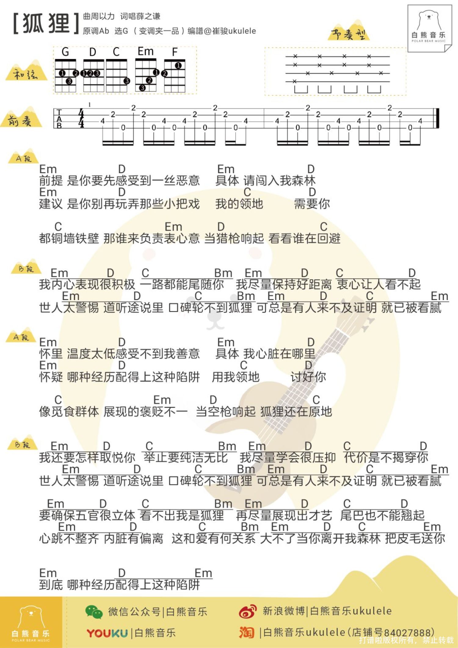 曲谱介绍: 这首歌发行有一段时间了,相信大家应该或多或少都听过这首歌。 这首歌在整体的曲风上,与之前薛之谦的风格大体一致,不过可以看出,薛之谦在尝试着改变。改变了一些以往的套路方式,采用了全新的架构(套路)来演绎这森林间的争斗。 首先,小编并不是薛粉,不过之前的几首歌比如《动物世界》,我个人还是比较喜欢的。在编配上这首歌没有画龙点睛之笔,不过在几个和弦的选择上可以看得出不同。这首《狐狸》表现出来的不是灵动,而是通过夹杂很多7音来表达出阴郁和诡异的感觉。 这首歌在情绪表达上算是常规的套路--不断的递进,大家可以从原曲三遍的副歌部分听出来,自己在演奏的时候也可以作出相应的调整,比如说改变右手的力度、不断丰富右手的节奏型等等。 左手前奏+主旋律部分,采用了分解和弦。这一段分解和弦的跨度稍有些大,可能对26寸琴的朋友不是很友好,毕竟有8品的跨度在。我自己在练习的时候出错的几率也相当高。如果对分解和弦有抵触,可以选择用扫弦+和弦的方式来表达,瞬间好按了许多。 和弦部分很多的大横按,一共有8个和弦,其中6个是封闭和弦,比重属实有些高。不过为了还原歌曲的情感,我认为还是可以这么做的。喜欢这首歌的同学,也可以当做左手和弦的练习曲来练。 狐狸ukulele弹唱演示   狐狸ukulele谱 Ab调版   《狐狸》尤克里里谱 G调版