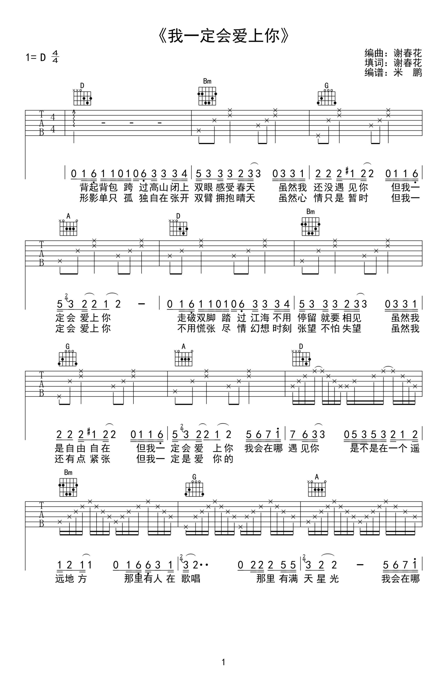 我一定会爱上你吉他谱 - 谢春花 - D调吉他弹唱谱