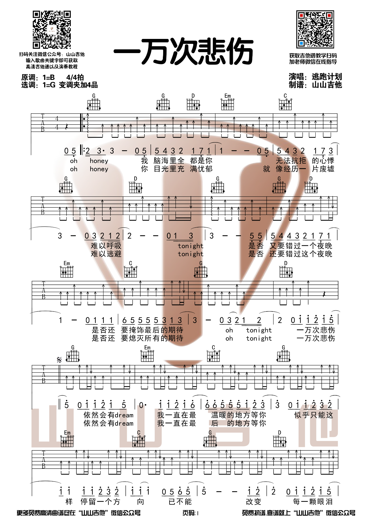 一万次悲伤吉他谱 - 逃跑计划 - G调吉他弹唱谱