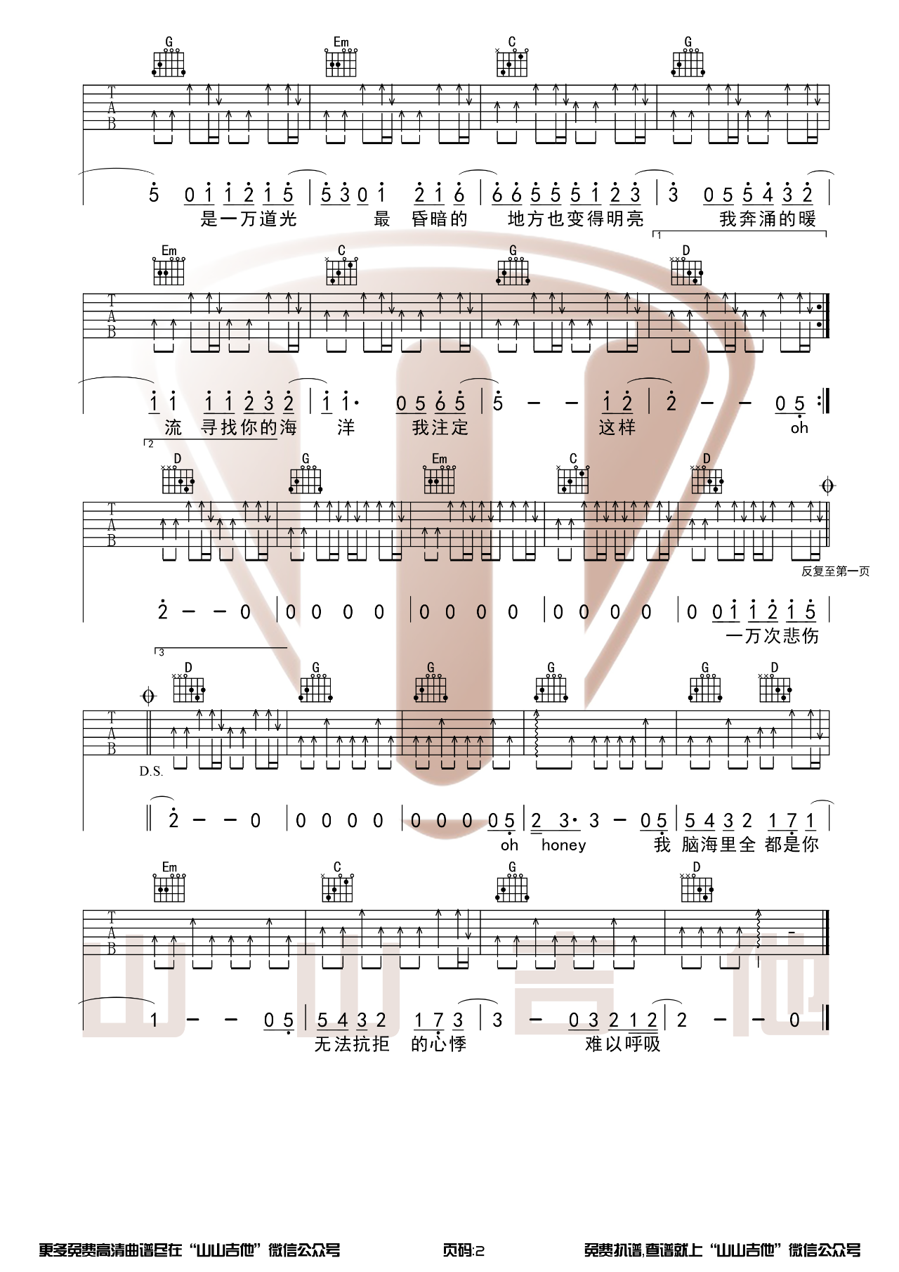 曲谱介绍: 曲谱说明:来自山山吉他编配「一万次悲伤」吉他谱,本谱采用G调和弦指法编配,演奏建议变调夹夹4品,也可以根据个人音域找到一个适合自己的位置,难度一般。只用到四个和弦,小白可学,简单好听!喜欢这首歌的朋友拿起吉他一起练起来吧,有任何问题请留言讨论。