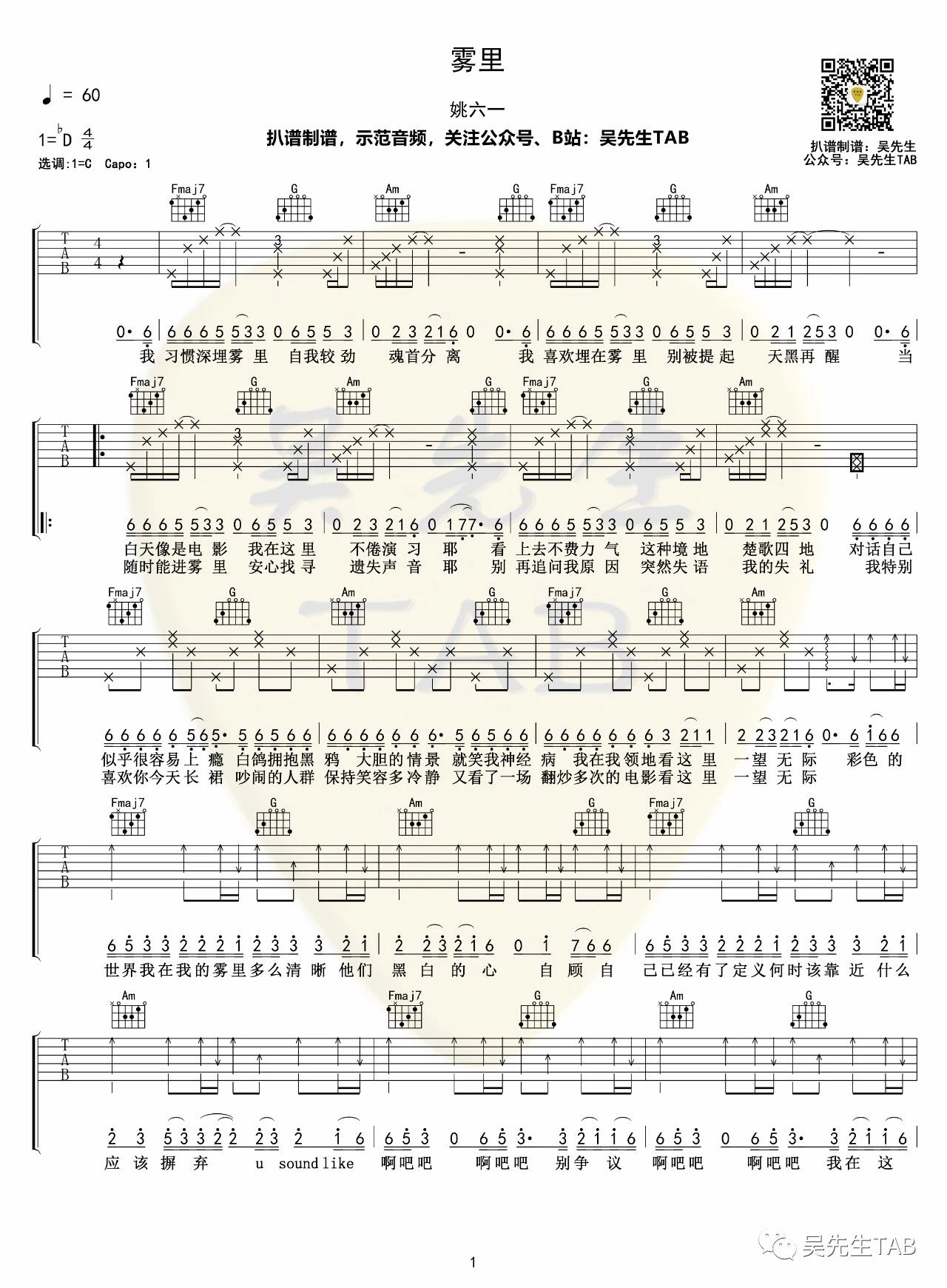 雾里吉他谱 - 姚六一 - C调吉他弹唱谱