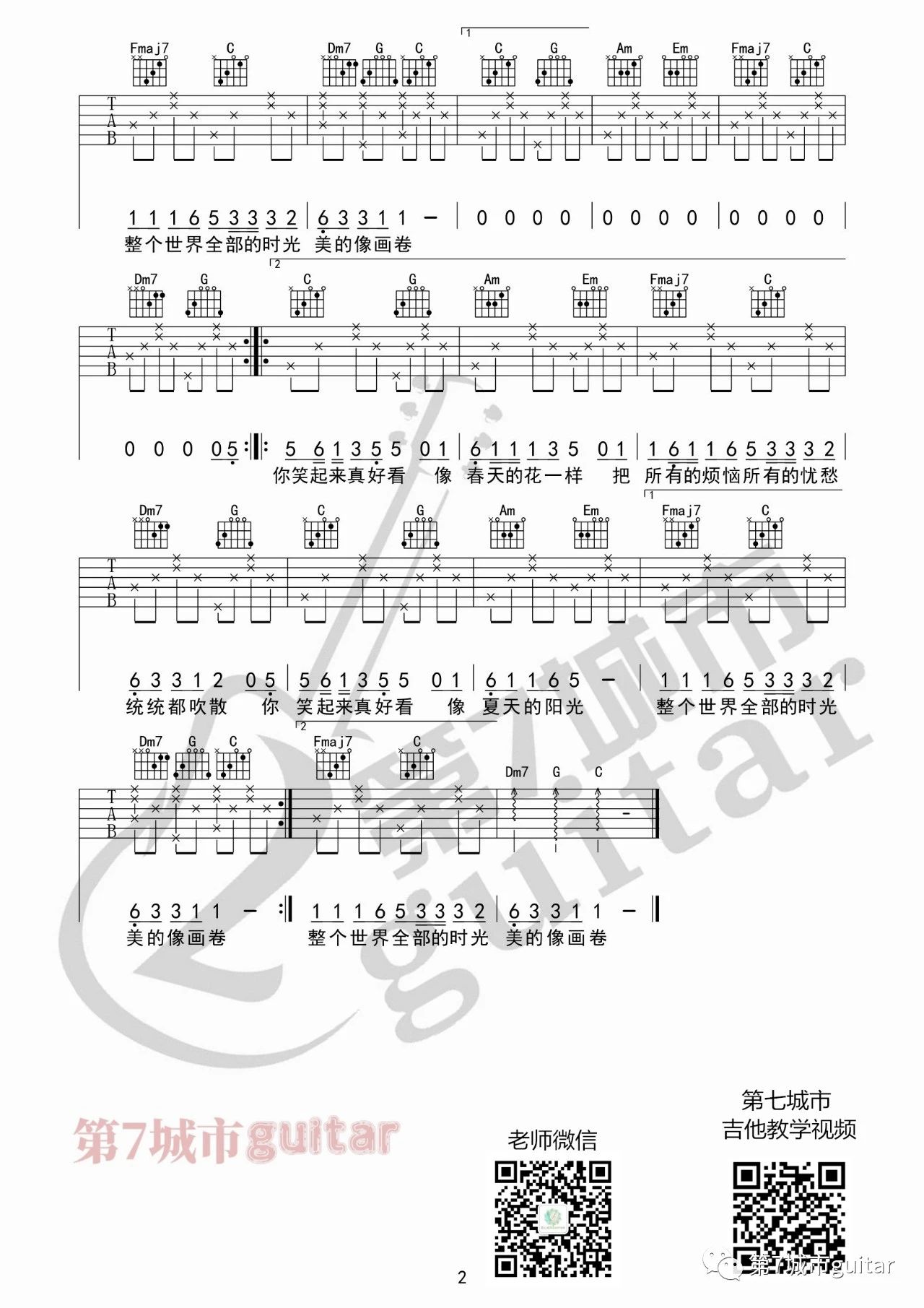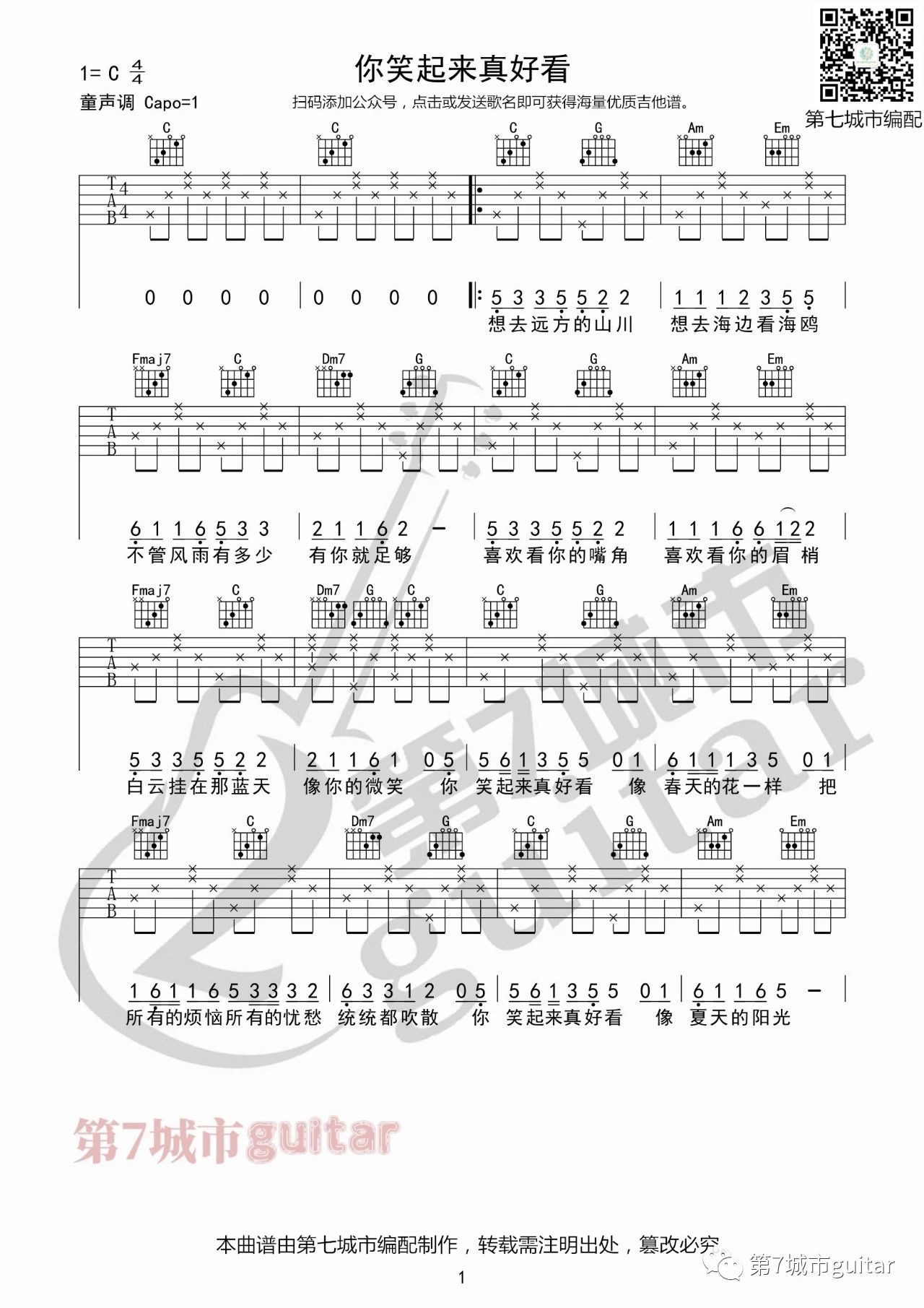 你笑起来真好看吉他谱 - C调吉他弹唱谱