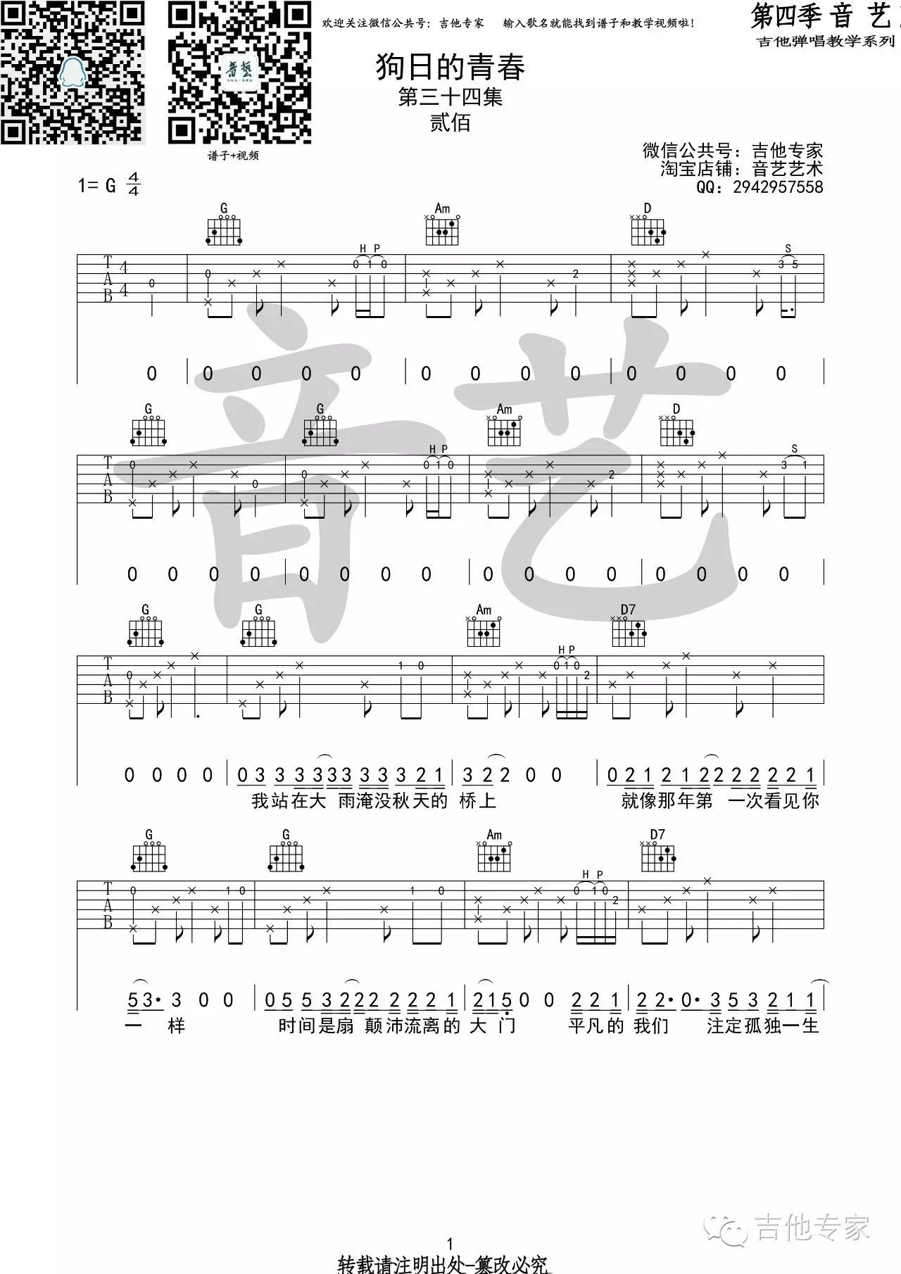狗日的青春吉他谱 - 贰佰 - G调吉他弹唱谱