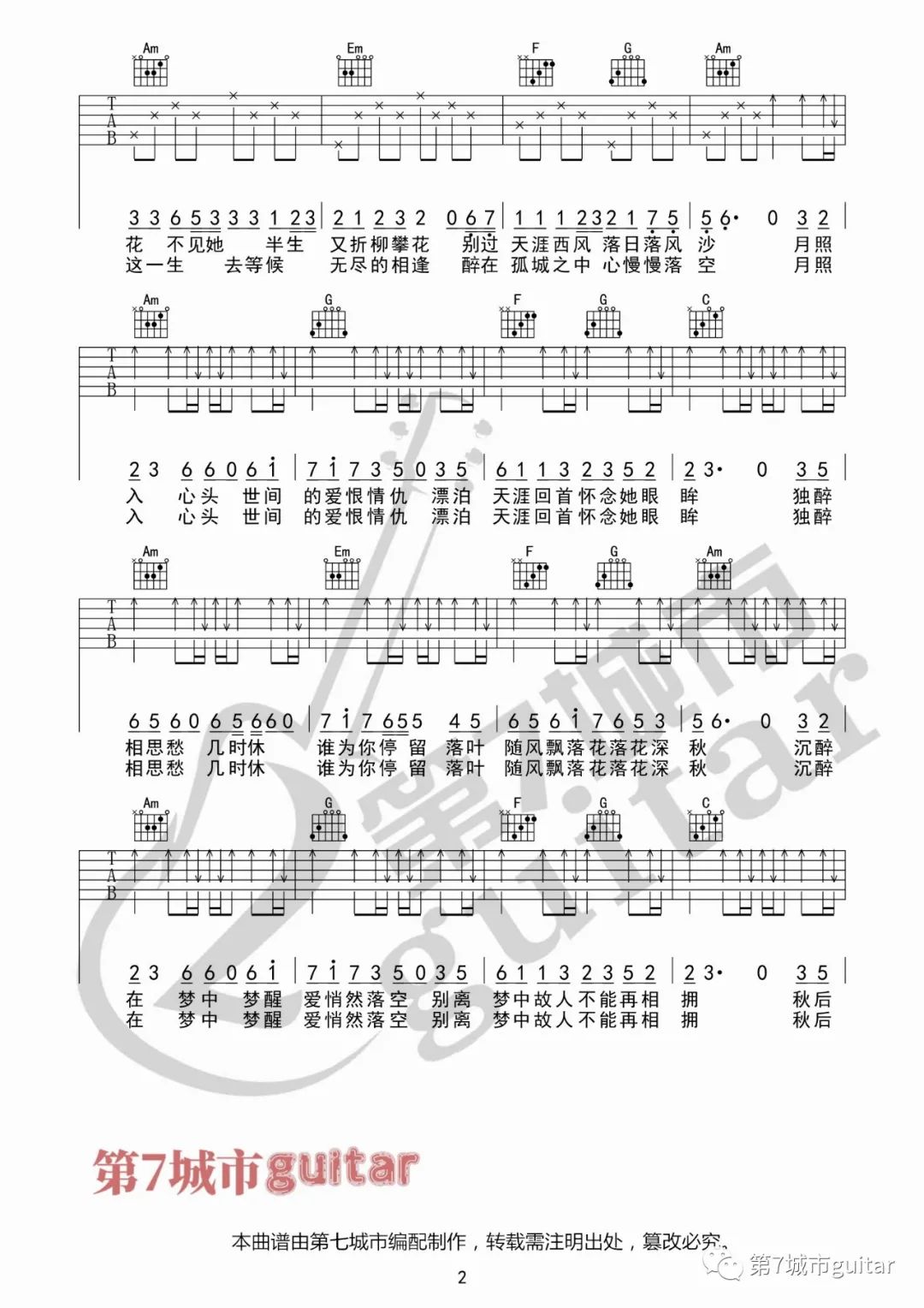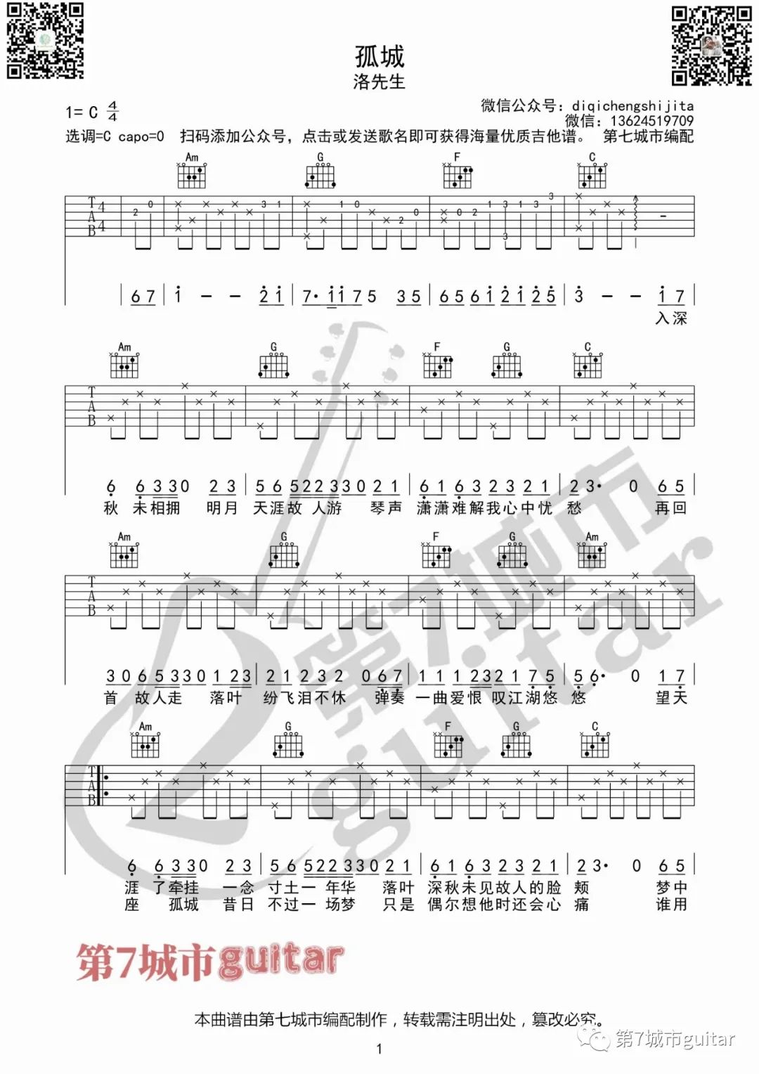 曲谱介绍: 曲谱说明:来自第七城市编配「孤城」吉他谱,本谱采用C调和弦指法编配,演奏建议变调夹夹0-1品,也可以根据个人音域找到一个适合自己的位置,难度一般。喜欢这首歌的朋友拿起吉他一起练起来吧,有任何问题请留言讨论。