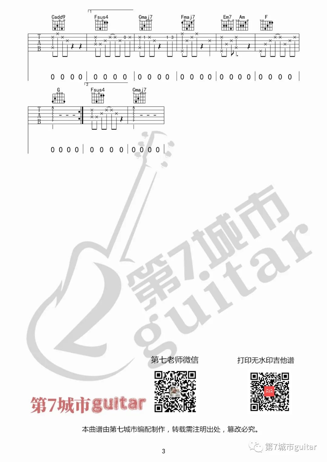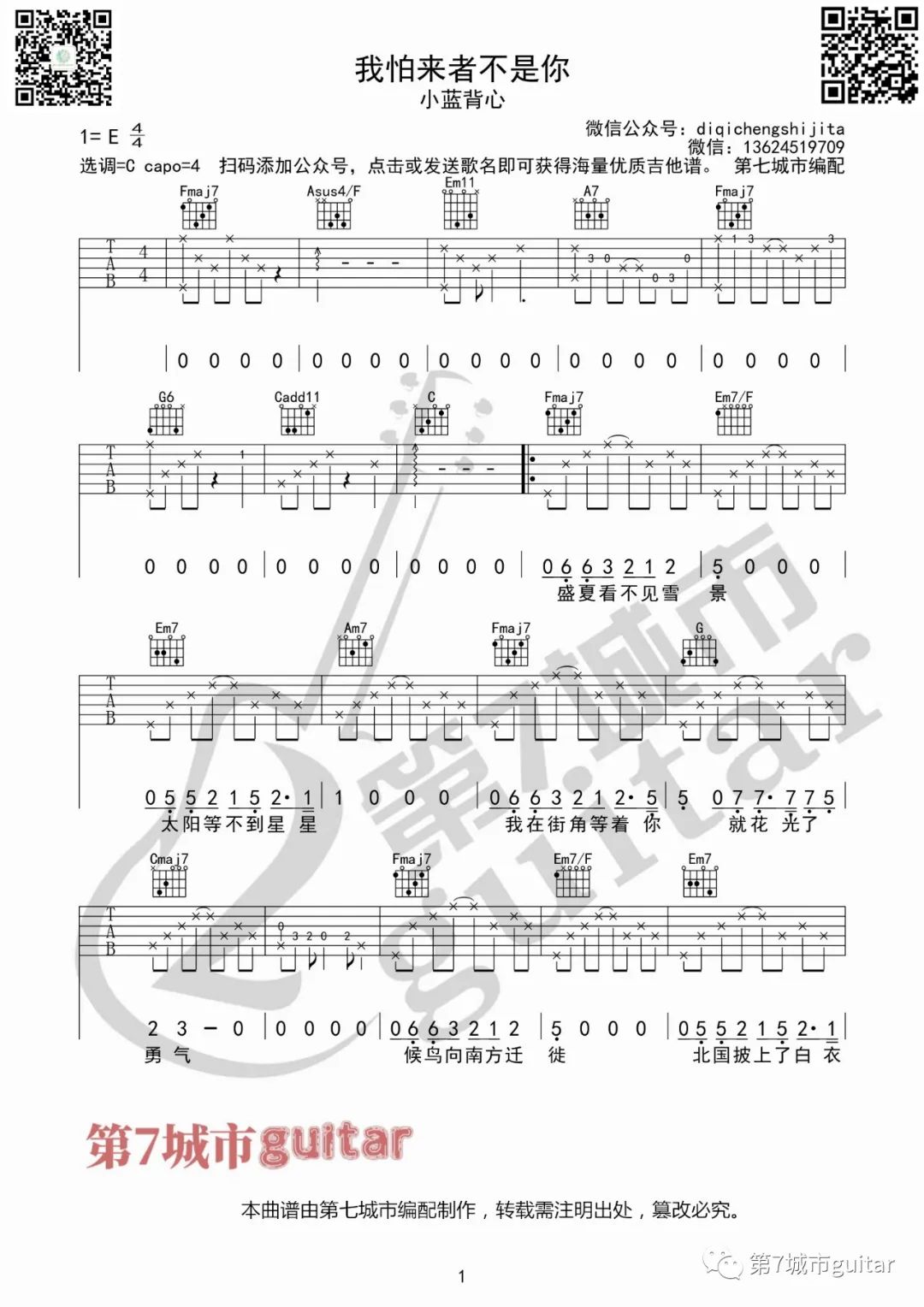曲谱介绍: 曲谱说明:来自第七城市编配「我怕来者不是你」吉他谱,本谱采用C调和弦指法编配,演奏建议变调夹夹4品,也可以根据个人音域找到一个适合自己的位置,难度简单。为了更好体验歌曲效果,第七老师采用降半音调弦来弹唱,效果更佳。女生建议变调夹4品弹唱。喜欢这首歌的朋友拿起吉他一起练起来吧,有任何问题请留言讨论。 我怕来者不是你吉他谱_小蓝背心_C调版吉他弹唱谱 第七城市
