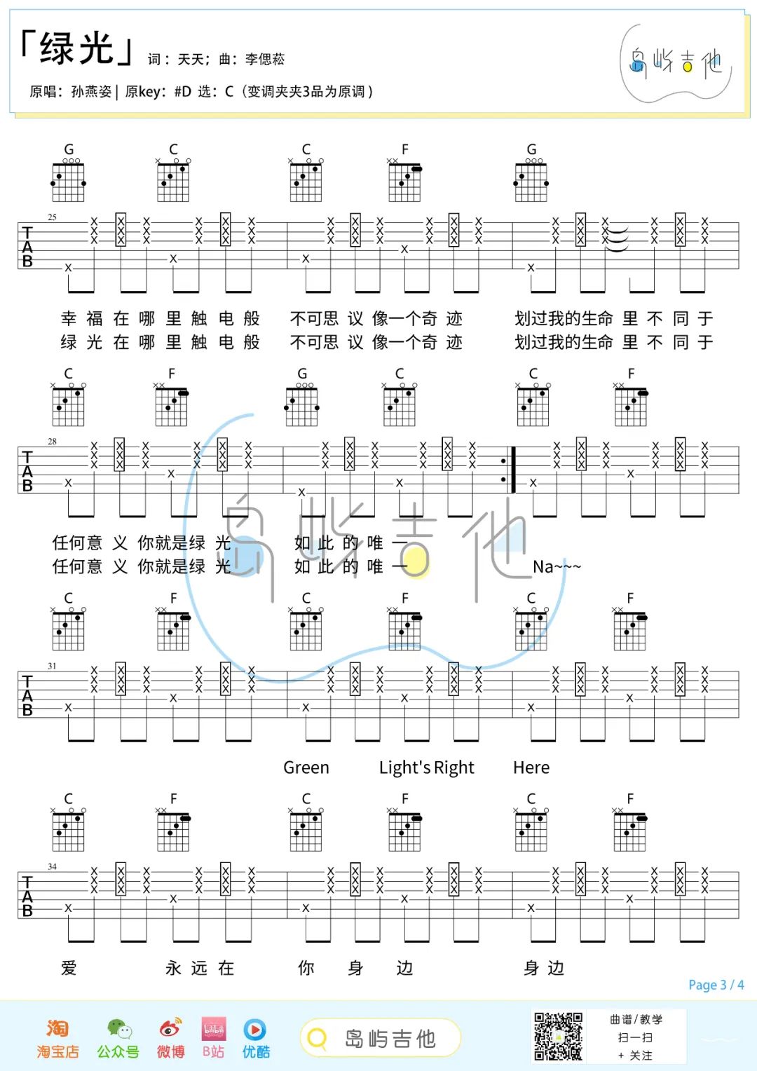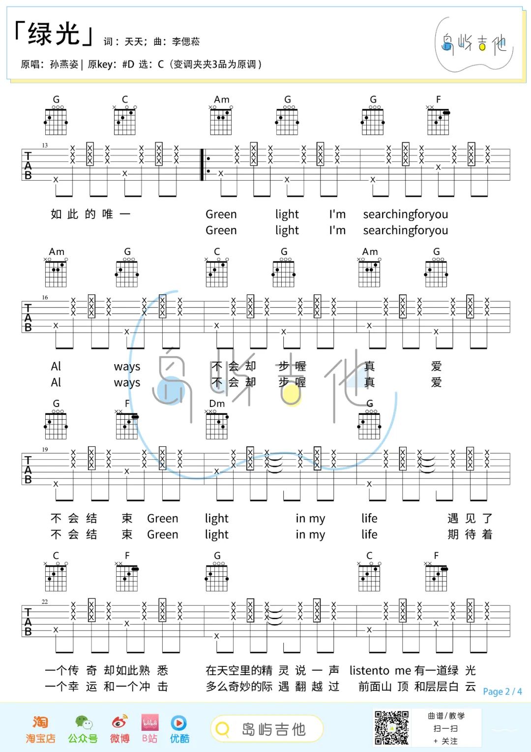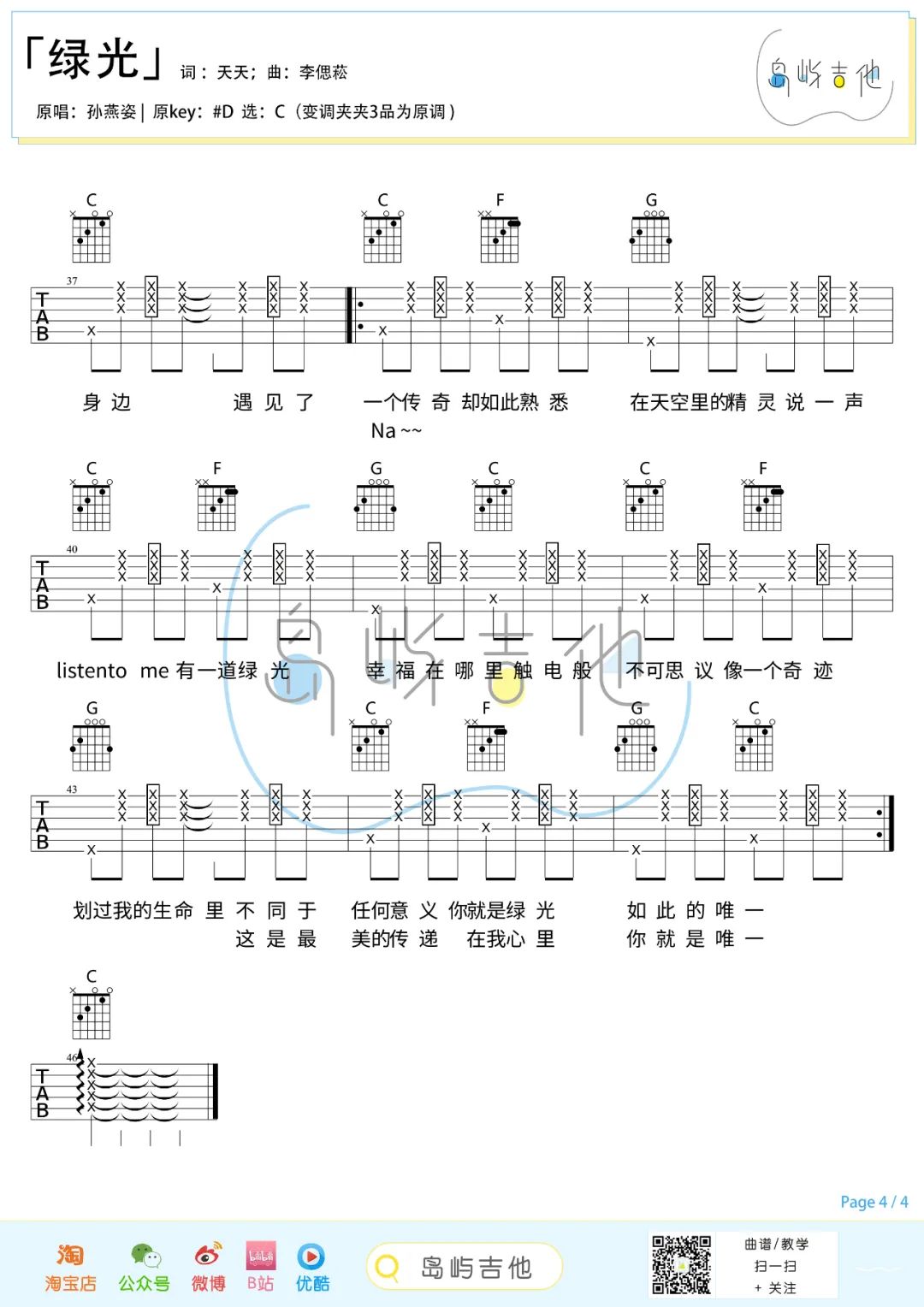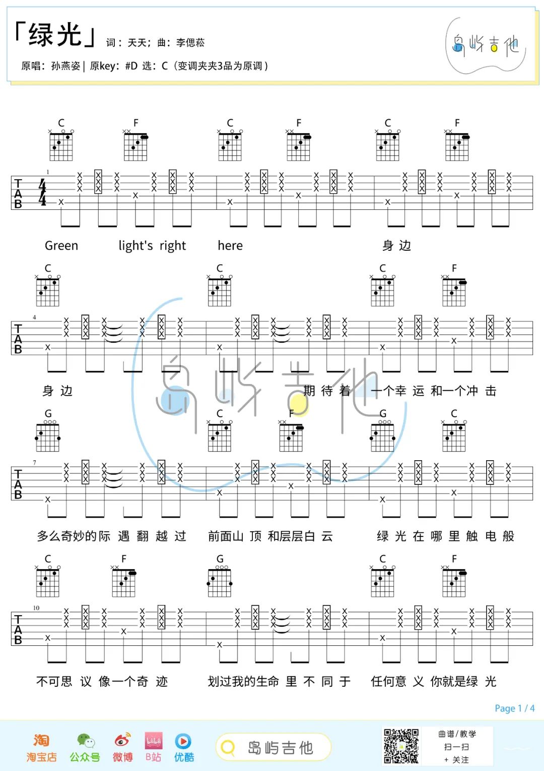 曲谱介绍: 曲谱说明:来自岛屿吉他编配「绿光」吉他谱,本谱采用C调和弦指法编配,演奏建议变调夹夹3品,也可以根据个人音域找到一个适合自己的位置,难度简单。欢快的节奏活泼跳跃,听起来心情一整个大愉悦!她把这首歌唱出了希望,听完这首歌,希望我们能带着这份希望继续前进~喜欢这首歌的朋友拿起吉他一起练起来吧,有任何问题请留言讨论。