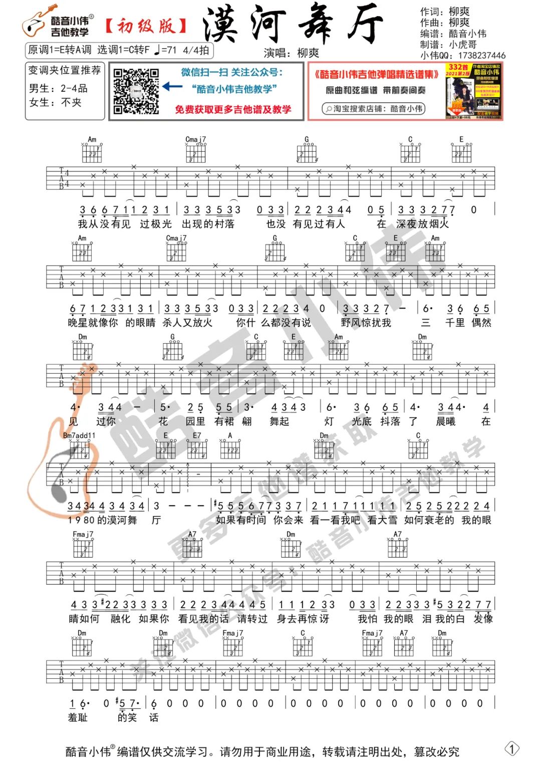 曲谱介绍: 曲谱说明:来自酷音小伟编配「漠河舞厅」吉他谱,本谱采用C转F调和弦指法编配,演奏建议变调夹夹2-4品,也可以根据个人音域找到一个适合自己的位置,难度一般。喜欢这首歌的朋友拿起吉他一起练起来吧,有任何问题请留言讨论。 本站共收录了4篇关于《漠河舞厅》的吉他谱,点此查看