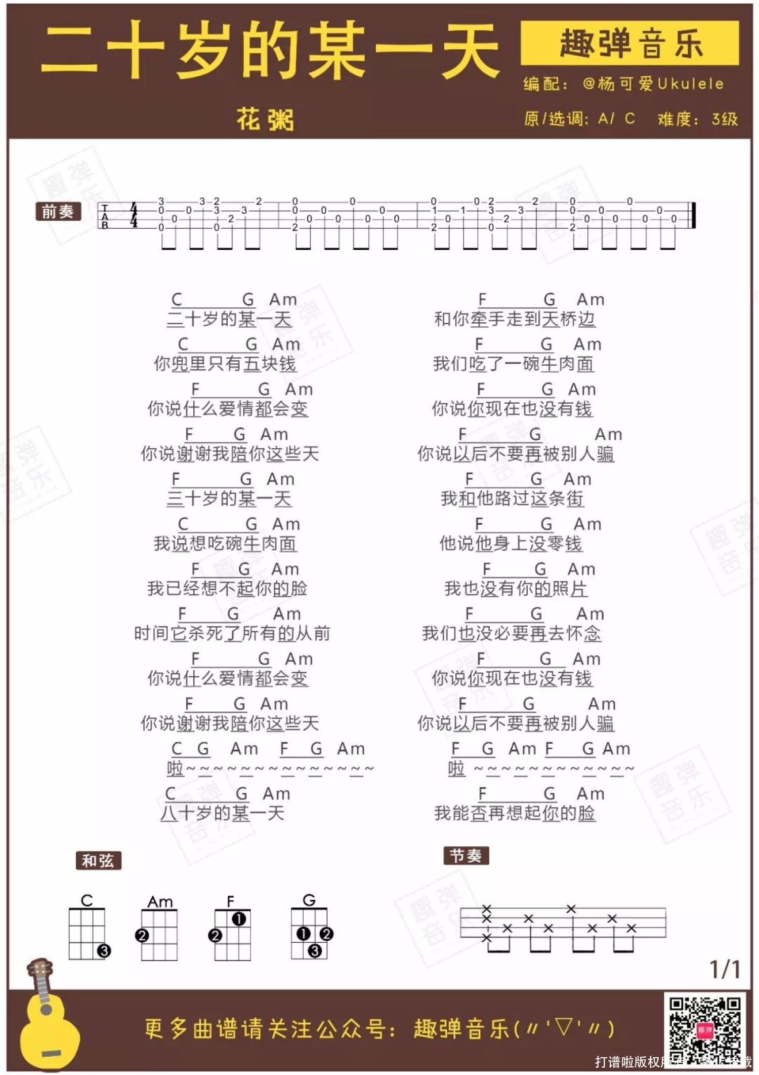 曲谱介绍: 清新老司机 花粥 这位其貌不扬的小姑娘,凭一首首接地气、戳心事的简单小曲在豆瓣音乐人受到关注。 明明有着软糯的少女音,却唱着耍流氓的歌词,唱着最平凡也是最普遍的生活。 我说想吃碗牛肉面 他说他身上没零钱 如果你只想简简单单把平淡日常放在嘴边哼唱,那就来听听花粥的歌吧。   二十岁的某一天 尤克里里谱