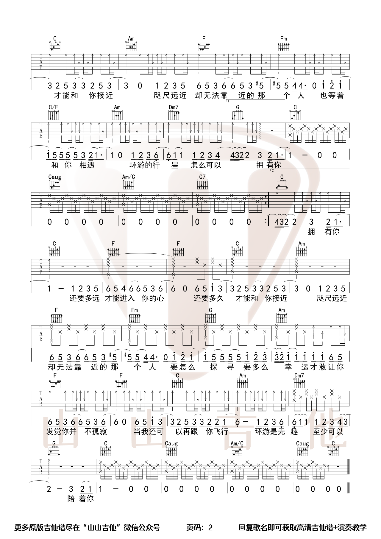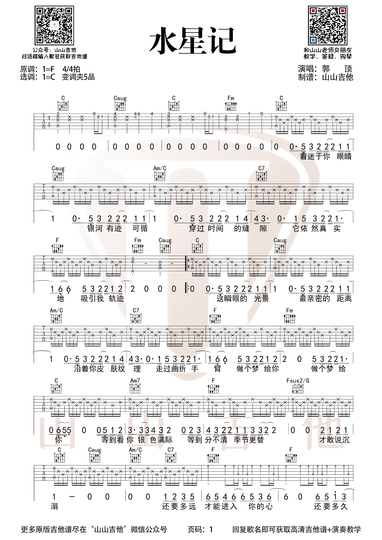 曲谱介绍: 曲谱说明:来自山山吉他编配「水星记」吉他谱,本谱采用C调和弦指法编配,演奏建议变调夹夹5品,也可以根据个人音域找到一个适合自己的位置,难度一般。还要多远才能进入你的心,还要多久才能和你接近。咫尺远近却,无法靠近的那个人,也等着和你相遇。喜欢这首歌的朋友拿起吉他一起练起来吧,有任何问题请留言讨论。本吉他谱配有视频 ➸ 点击播放