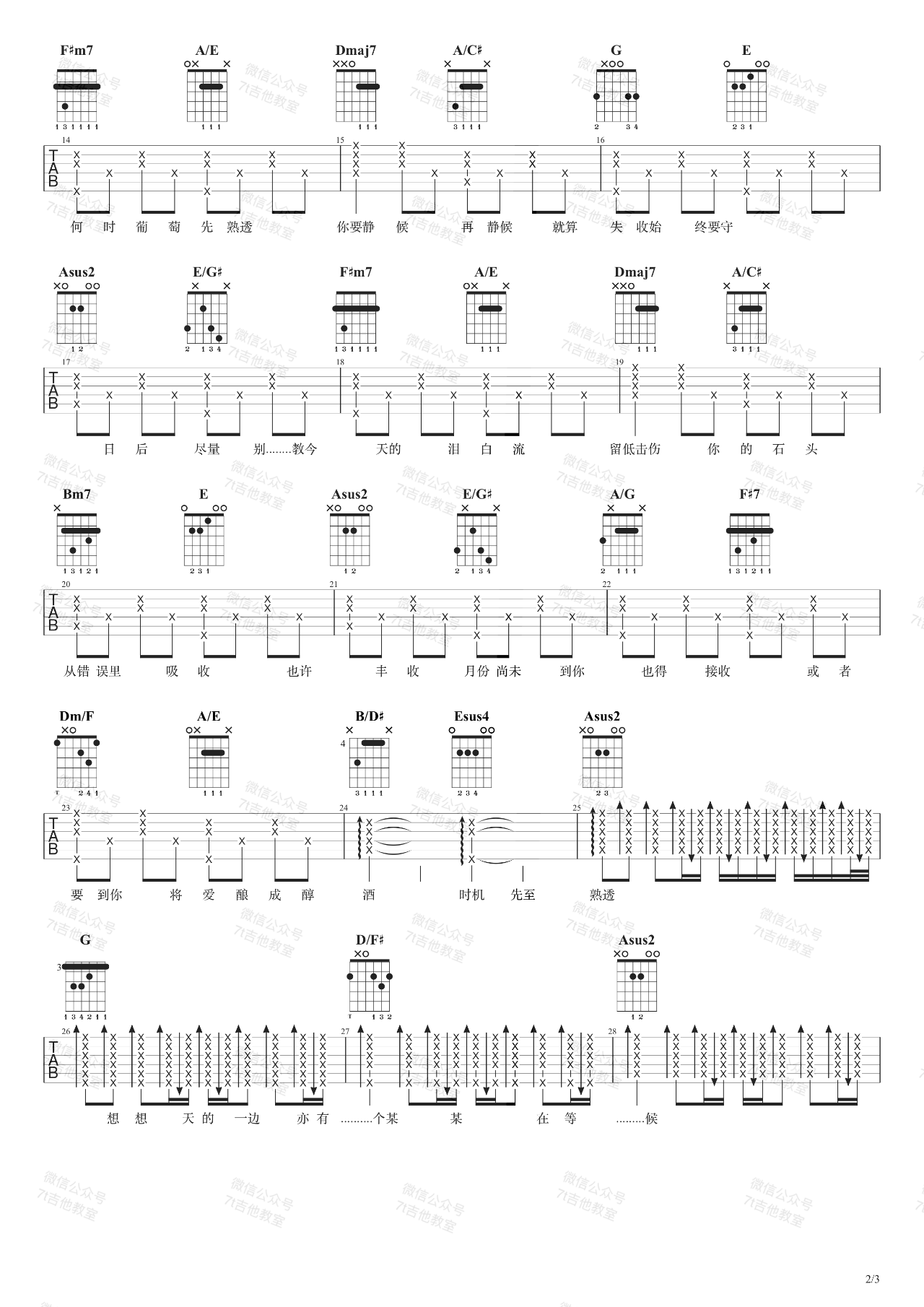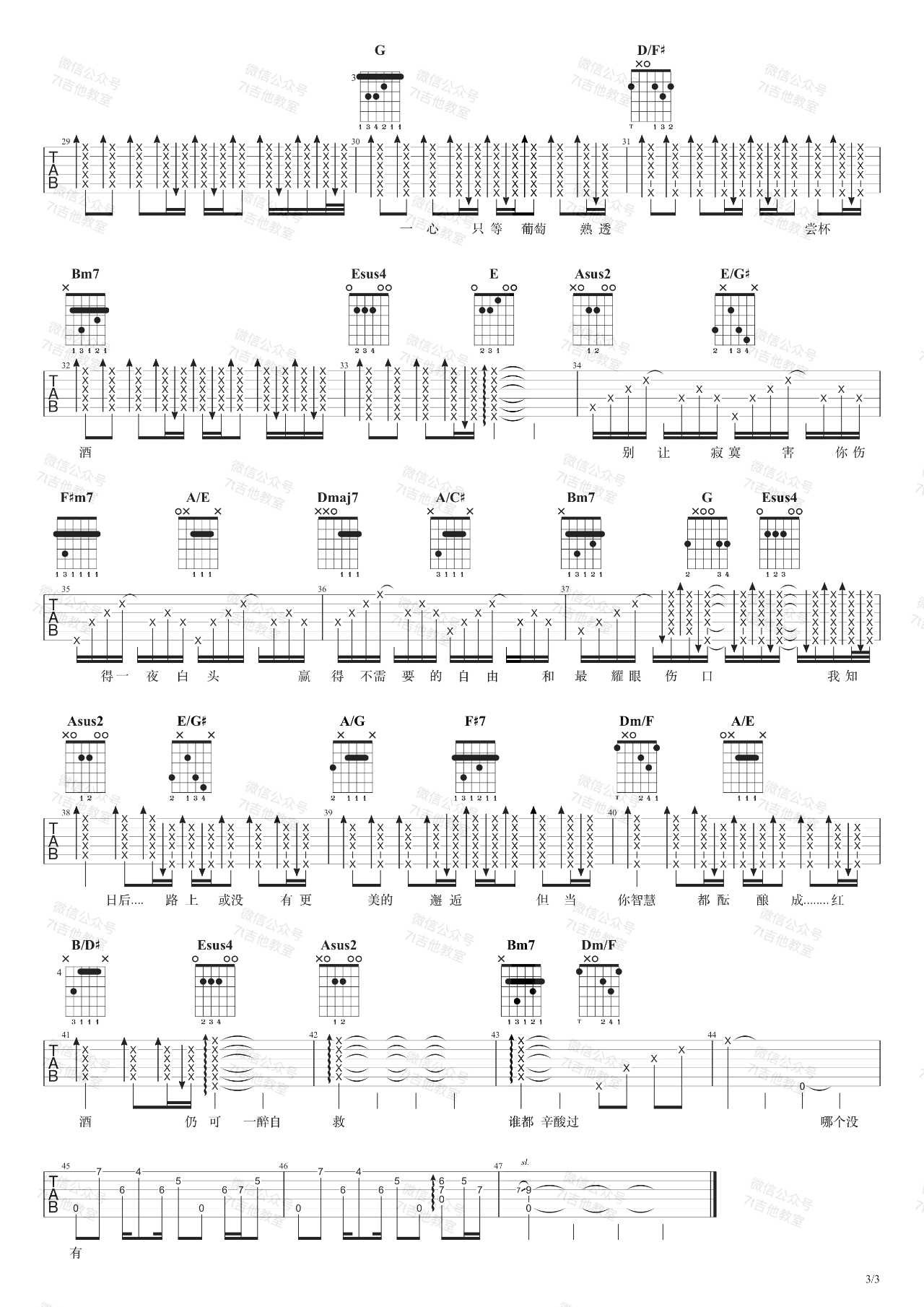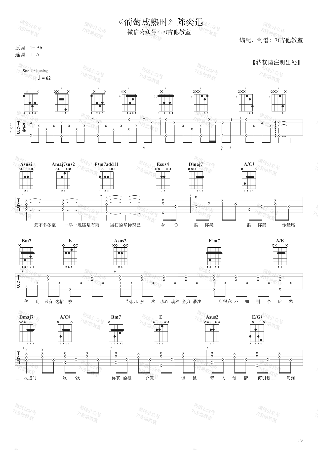 曲谱介绍: 曲谱说明:来自7t吉他教室编配「葡萄成熟时」吉他谱,本谱采用A调和弦指法编配,演奏建议变调夹夹1品,也可以根据个人音域找到一个适合自己的位置,难度一般。这首歌的原调是Bb大调,我用的是A大调的指法来编配(我用了降半音调弦)。如果想弹原调,用标准音调弦并且变调夹夹在第1品就可以哦~喜欢这首歌的朋友拿起吉他一起练起来吧,有任何问题请留言讨论。本吉他谱配有视频 ➸ 点击播放